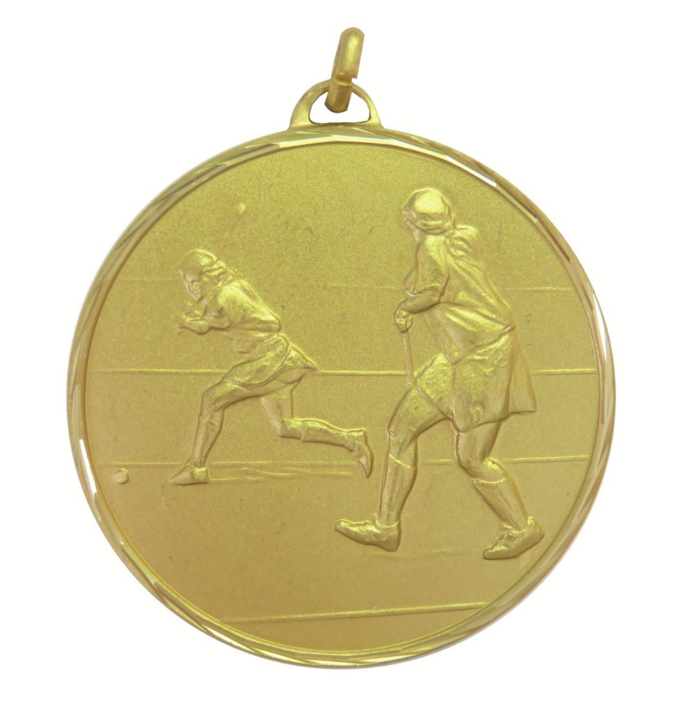 A top quality embossed diamond edged gold female hockey medal made from brass. The medal displays two female hockey players in action. The diameter is 50mm and the thickness is 3mm giving the medal a heavy feel. This medal can be engraved on the reverse and comes complete with a loop to accommodate a ribbon.