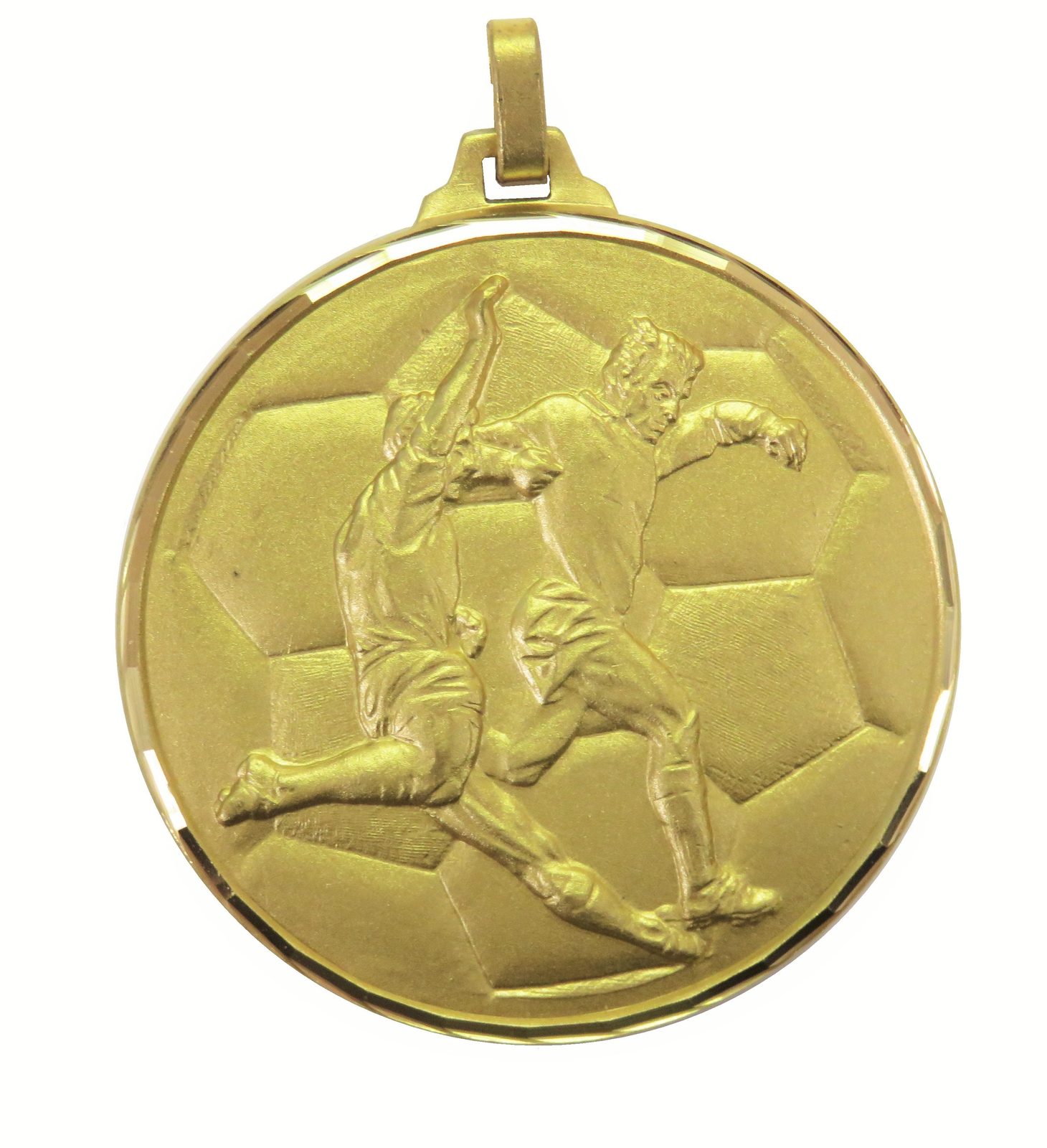 A top quality embossed diamond edged gold football medal made from brass. The medal displays two footballers in a tackle action in front of a laurel design. Select from 42mm, 50mm or 70mm diameter and the thickness is 3mm giving the medal a heavy feel. This medal can be engraved on the reverse and comes complete with a loop to accomadate a ribbon.