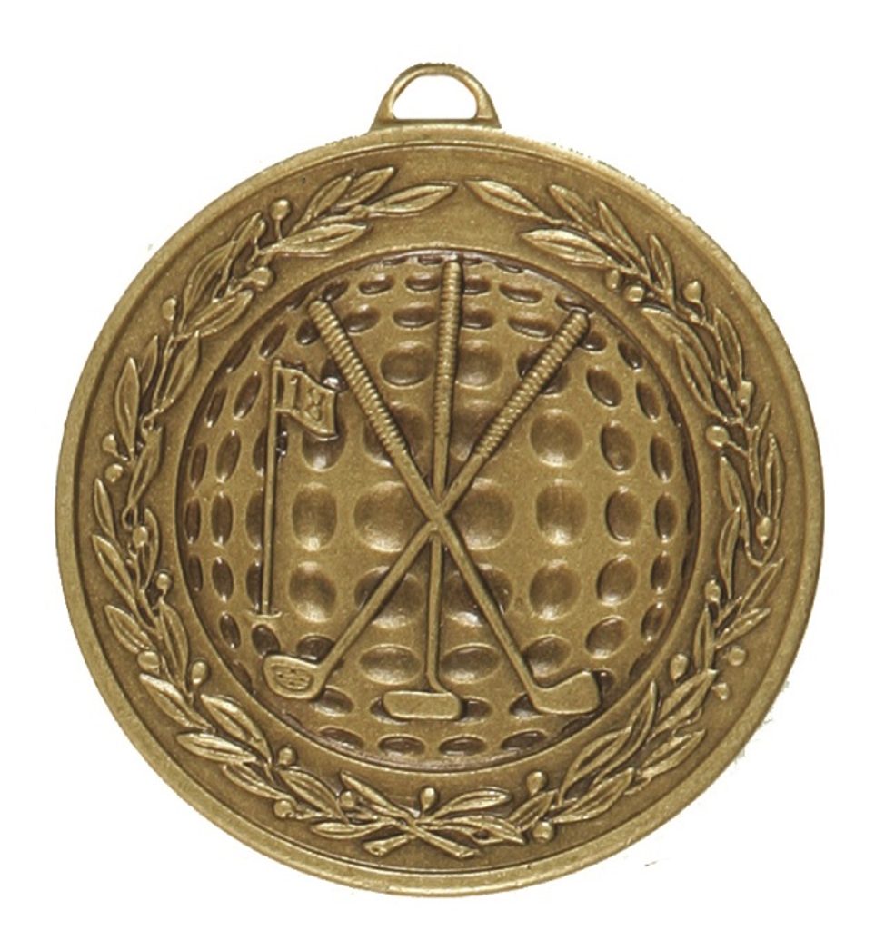 A top quality embossed diamond edged bronze golf medal made from brass. The medal displays a golf ball backdrop with three clubs and flag within a laurel design. The diameter is 50mm and the thickness is 3mm giving the medal a heavy feel. This medal can be engraved on the reverse and comes complete with a loop to accomadate a ribbon.