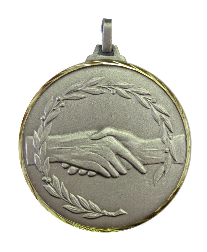 A top quality embossed diamond edged silver metal handshake medal made from brass. The medal displays a classic handshake within a laurel design. Ideal for a fair play award too. The diameter is 52mm and the thickness is 3mm giving the medal a heavy feel. This medal can be engraved on the reverse and comes complete with a loop to accomadate a ribbon.