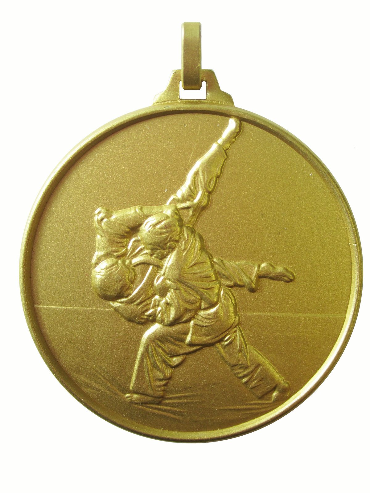 A top quality embossed diamond edged gold judo medal made from brass. The medal displays a judo bout. The diameter is 50mm and the thickness is 3mm giving the medal a heavy feel. This medal can be engraved on the reverse and comes complete with a loop to accomadate a ribbon.