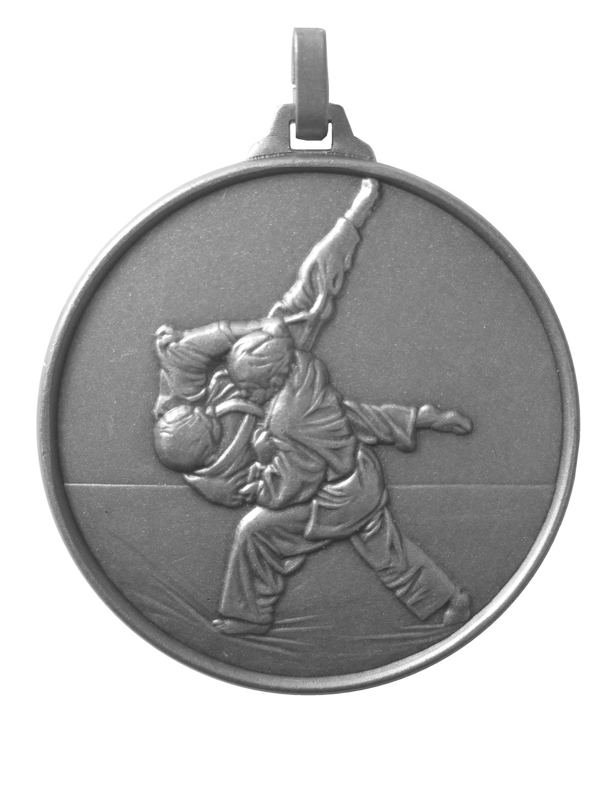 A top quality embossed diamond edged silver judo medal made from brass. The medal displays a judo bout. The diameter is 50mm and the thickness is 3mm giving the medal a heavy feel. This medal can be engraved on the reverse and comes complete with a loop to accomadate a ribbon.