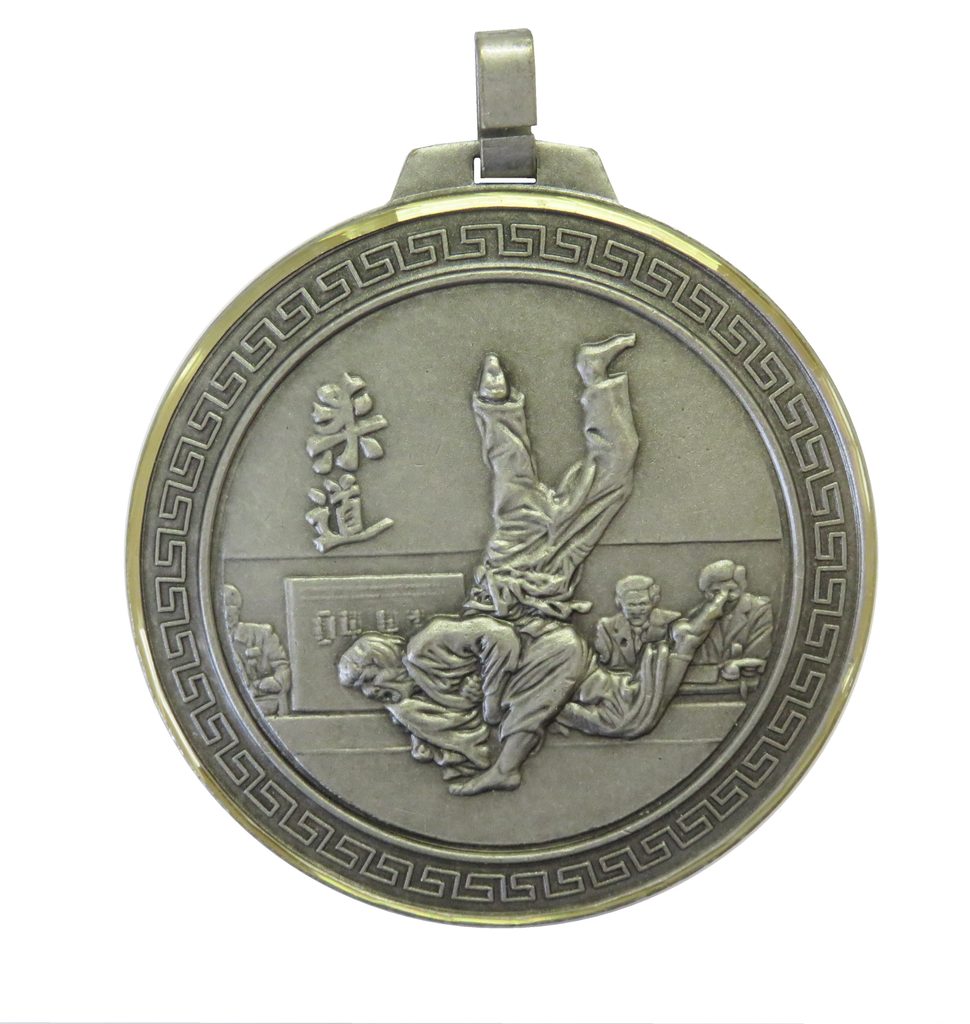 A top quality embossed diamond edged silver judo medal made from brass. The medal displays a judo bout. The diameter is 70mm and the thickness is 3mm giving the medal a heavy feel. This medal can be engraved on the reverse and comes complete with a loop to accommodate a ribbon.