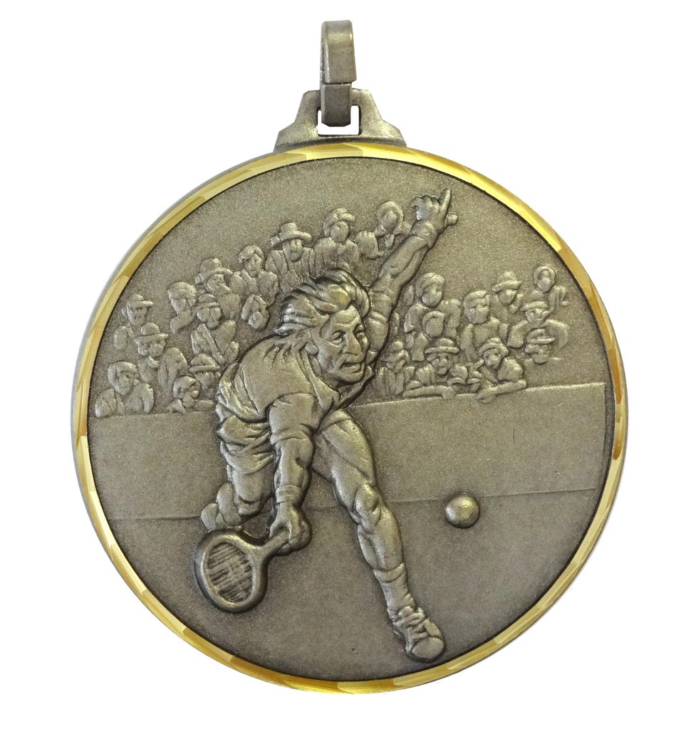A top quality embossed diamond edged silver tennis medal made from brass. The medal displays a male tennis player in match action. The diameter is 52mm and the thickness is 3mm giving the medal a heavy feel. This medal can be engraved on the reverse and comes complete with a loop to accomadate a ribbon.