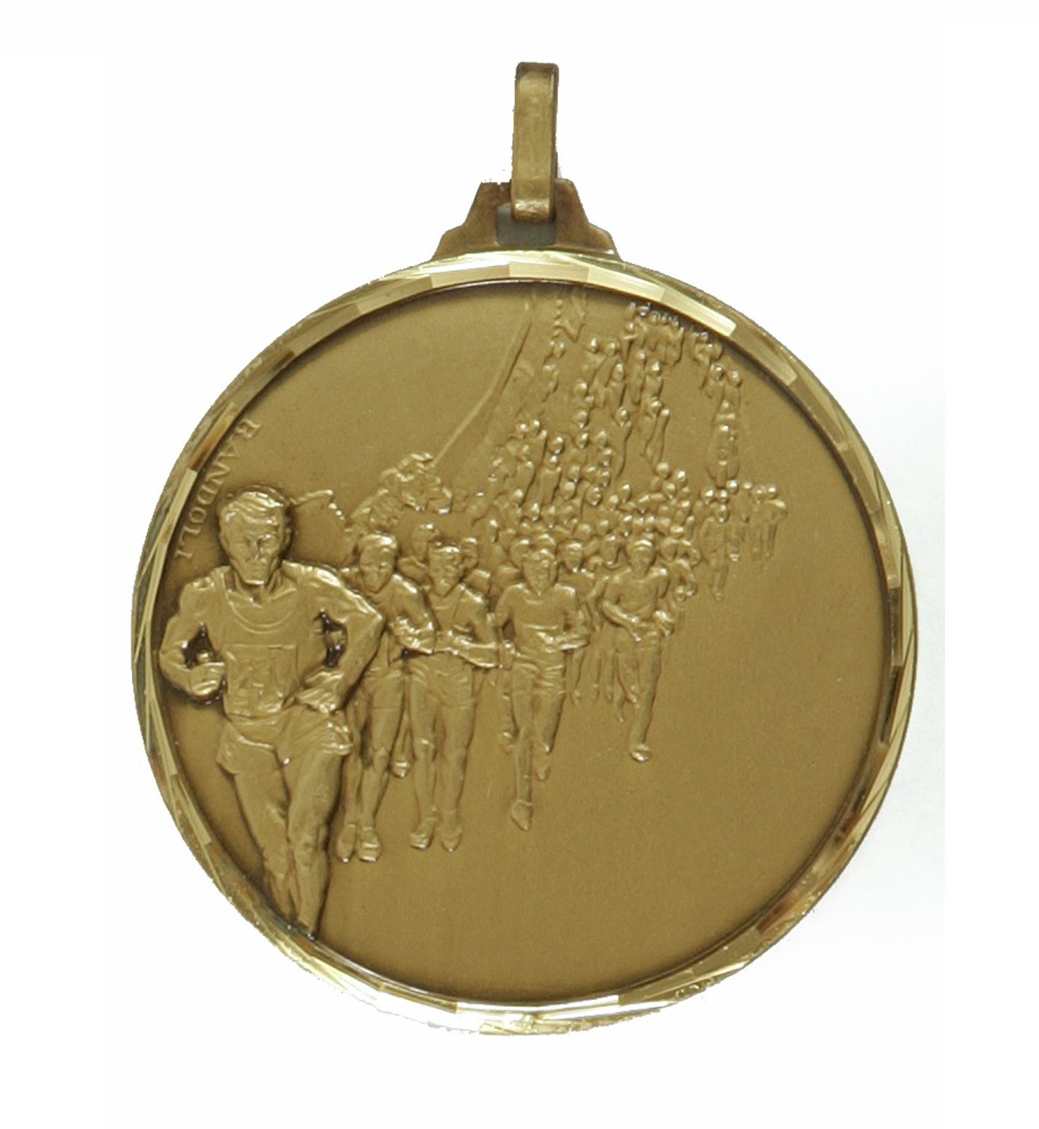 A top quality embossed diamond edged bronze marathon running medal made from brass. The medal displays runners in action. Select from 42mm or 52mm diameter and the thickness is 3mm giving the medal a heavy feel. This medal can be engraved on the reverse and comes complete with a loop to accomadate a ribbon.