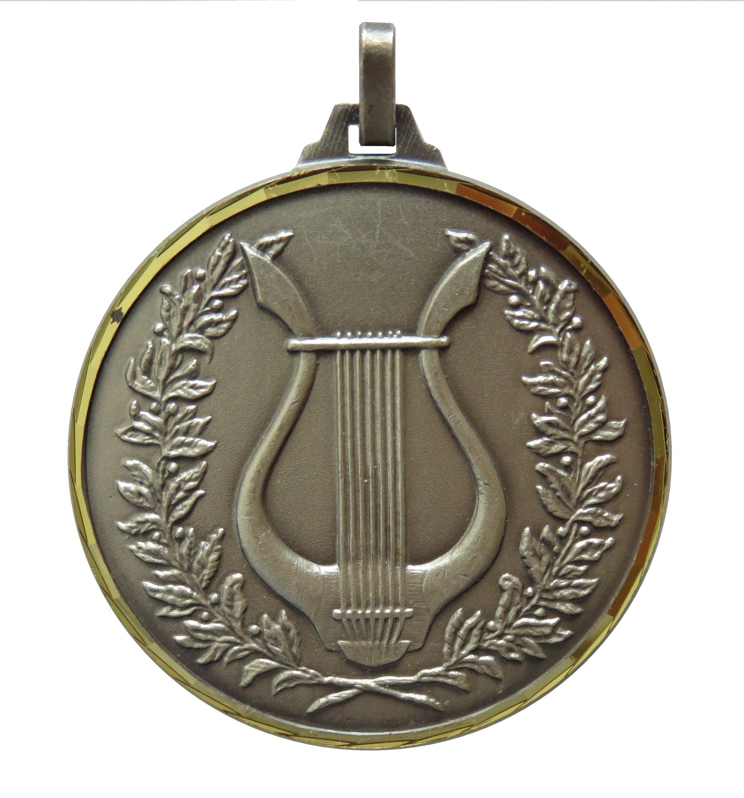 A top quality embossed diamond edged silver music medal made from brass. The medal displays a musical instrument within a laurel design. The diameter is 50mm and the thickness is 3mm giving the medal a heavy feel. This medal can be engraved on the reverse and comes complete with a loop to accommodate a ribbon.