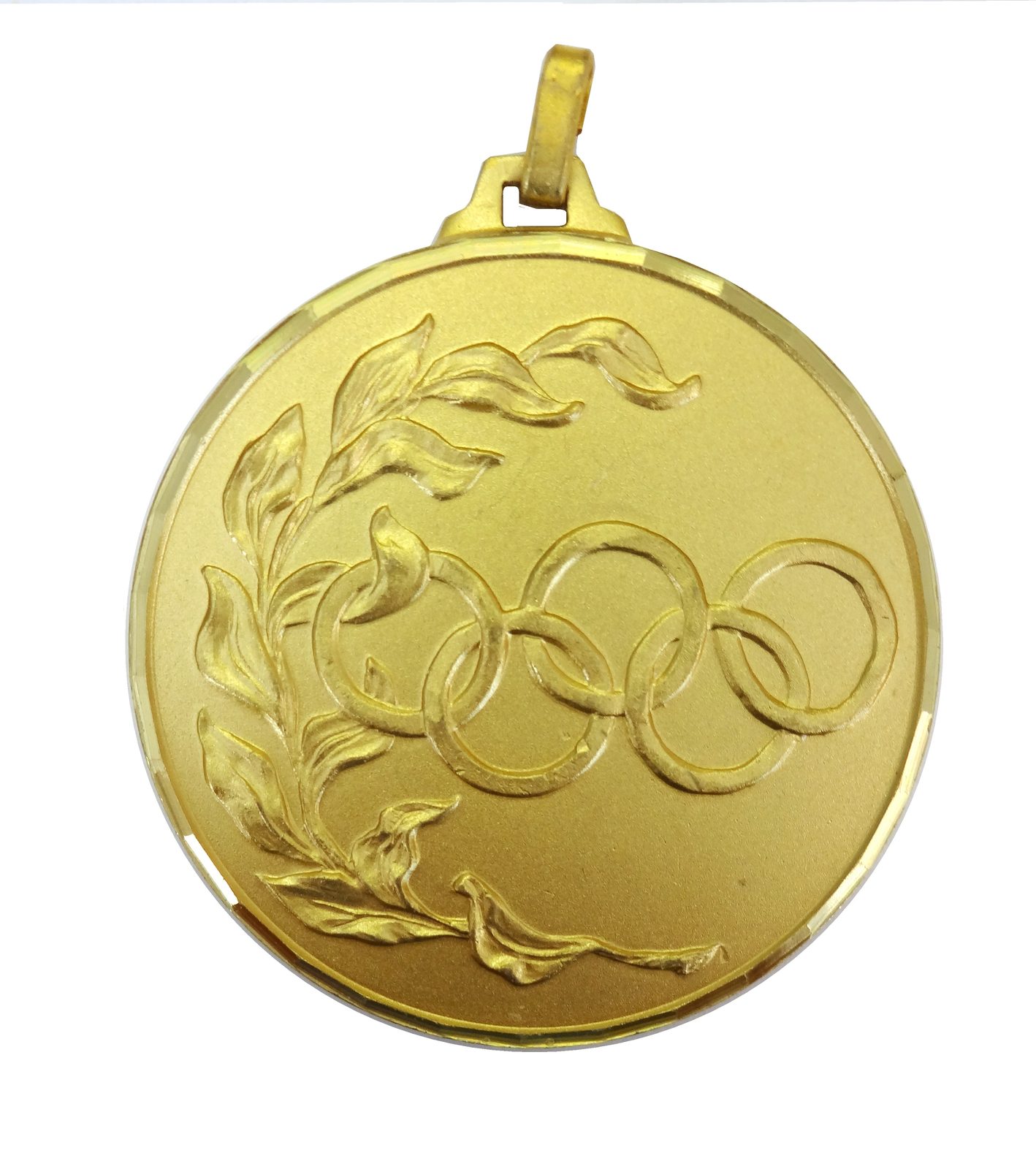 A top quality embossed diamond edged gold Olympic emblem medal made from brass taken from the Olympic range. The medal displays the iconic Olympic emblem. The diameter is 52mm and the thickness is 3mm giving the medal a heavy feel. This medal can be engraved on the reverse and comes complete with a loop to accomadate a ribbon.