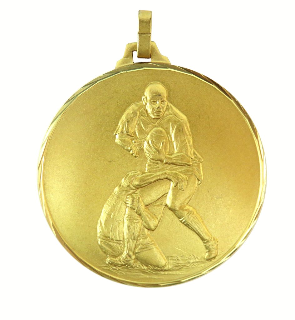 A top quality embossed diamond edged gold rugby medal made from brass. The medal displays two rugby players in action. Select from 42mm or 52mm diameter and the thickness is 3mm giving the medal a heavy feel. This medal can be engraved on the reverse and comes complete with a loop to accomadate a ribbon.