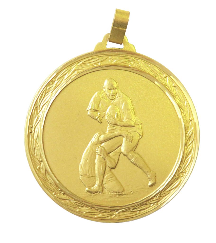 A top quality embossed diamond edged gold rugby medal made from brass. The medal displays two rugby players in action. The diameter is 60mm and the thickness is 3mm giving the medal a heavy feel. This medal can be engraved on the reverse and comes complete with a loop to accommodate a ribbon.