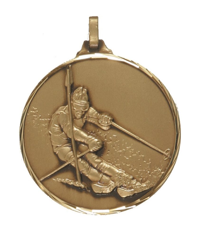 A top quality embossed diamond edged bronze skiing medal made from brass. The medal displays a skier in slalom action. The diameter is 52mm and the thickness is 3mm giving the medal a heavy feel. This medal can be engraved on the reverse and comes complete with a loop to accomadate a ribbon.