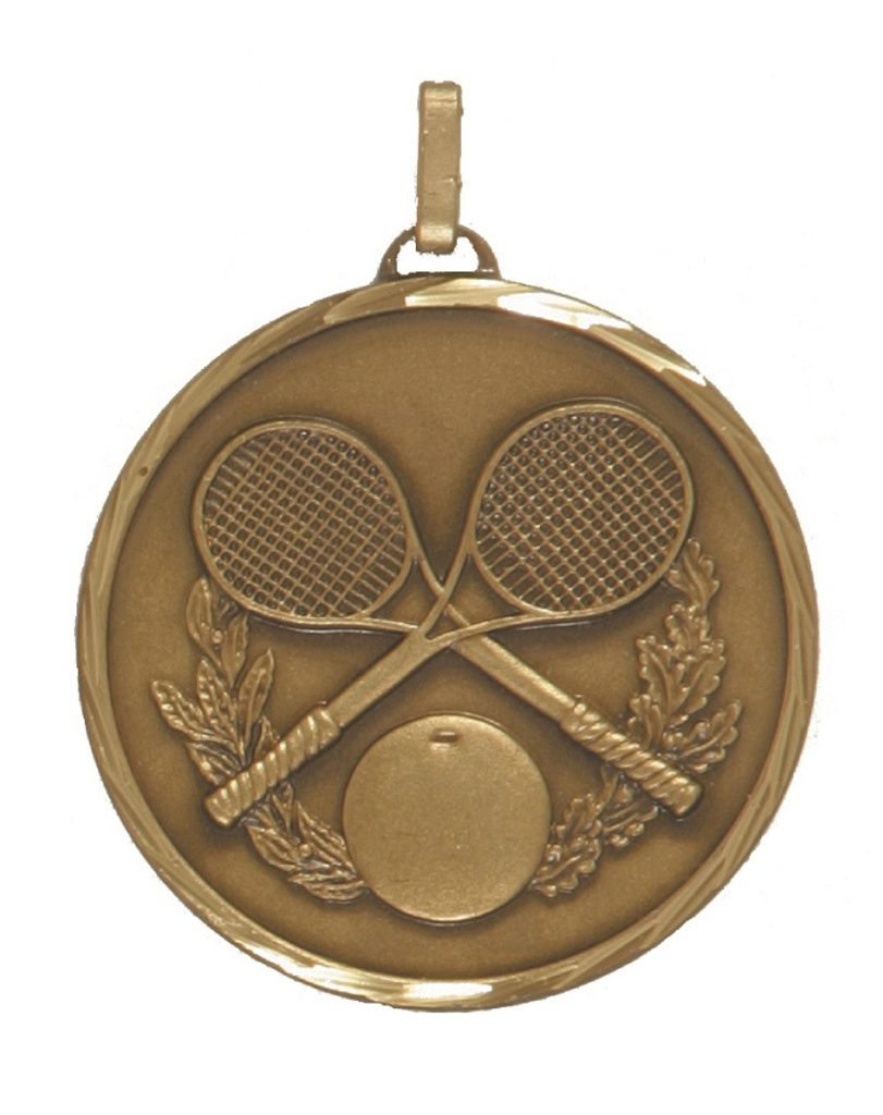 A top quality embossed diamond edged bronze squash medal made from brass. The medal displays crossed squash rackets and a ball. The diameter is 52mm and the thickness is 3mm giving the medal a heavy feel. This medal can be engraved on the reverse and comes complete with a loop to accomadate a ribbon.