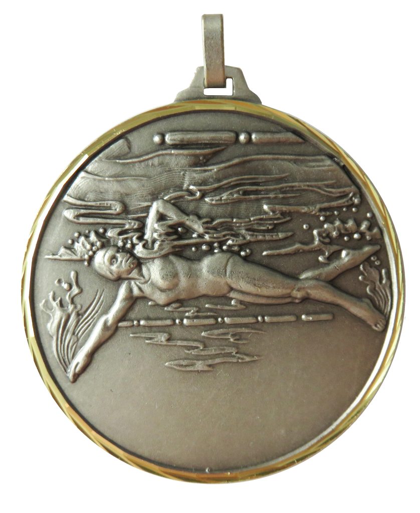 A top quality embossed diamond edged silver swimming medal made from brass. The medal displays a female swimmer in front crawl stroke action. Select from 42mm or 52mm diameter and the thickness is 3mm giving the medal a heavy feel. This medal can be engraved on the reverse and comes complete with a loop to accomadate a ribbon.
