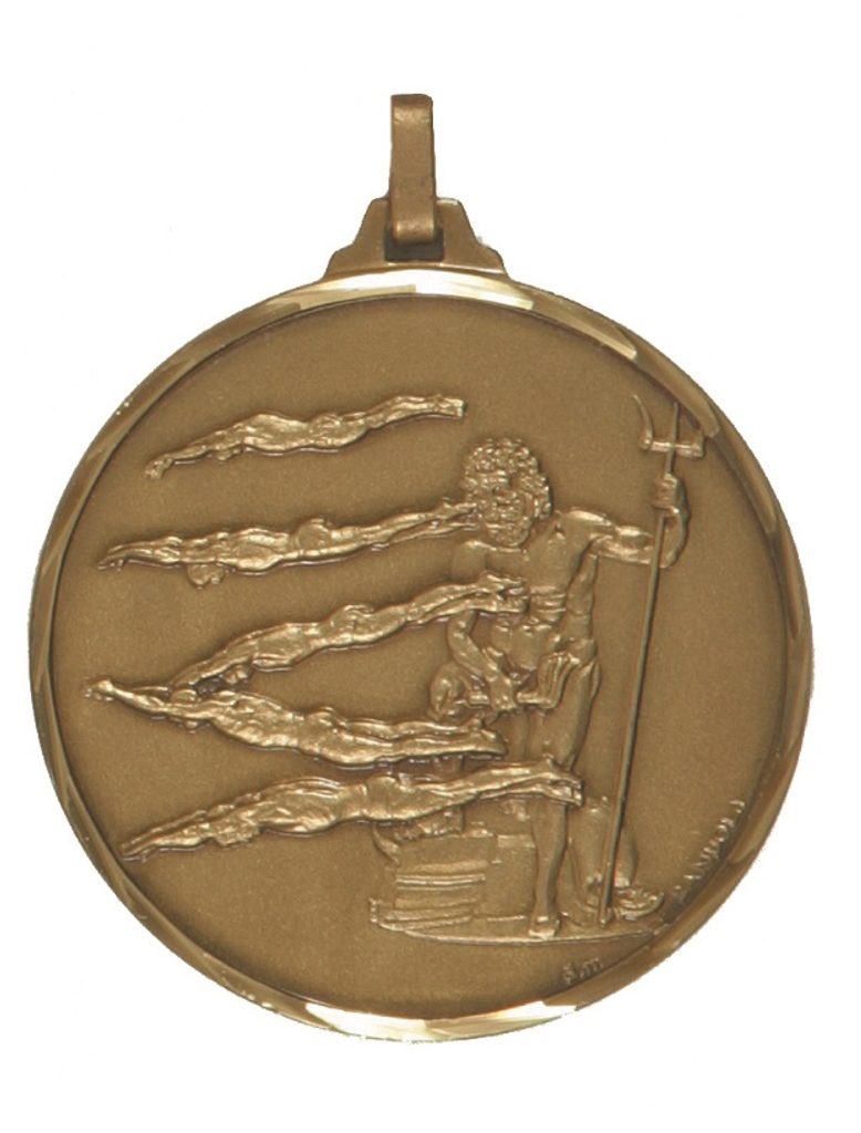 A top quality embossed diamond edged bronze swimming medal made from brass. The medal displays a male swimmer in front crawl, back crawl, breaststroke and butterfly stroke action with Neptune in the background. Select from 42mm or 52mm diameter and the thickness is 3mm giving the medal a heavy feel. This medal can be engraved on the reverse and comes complete with a loop to accomadate a ribbon.