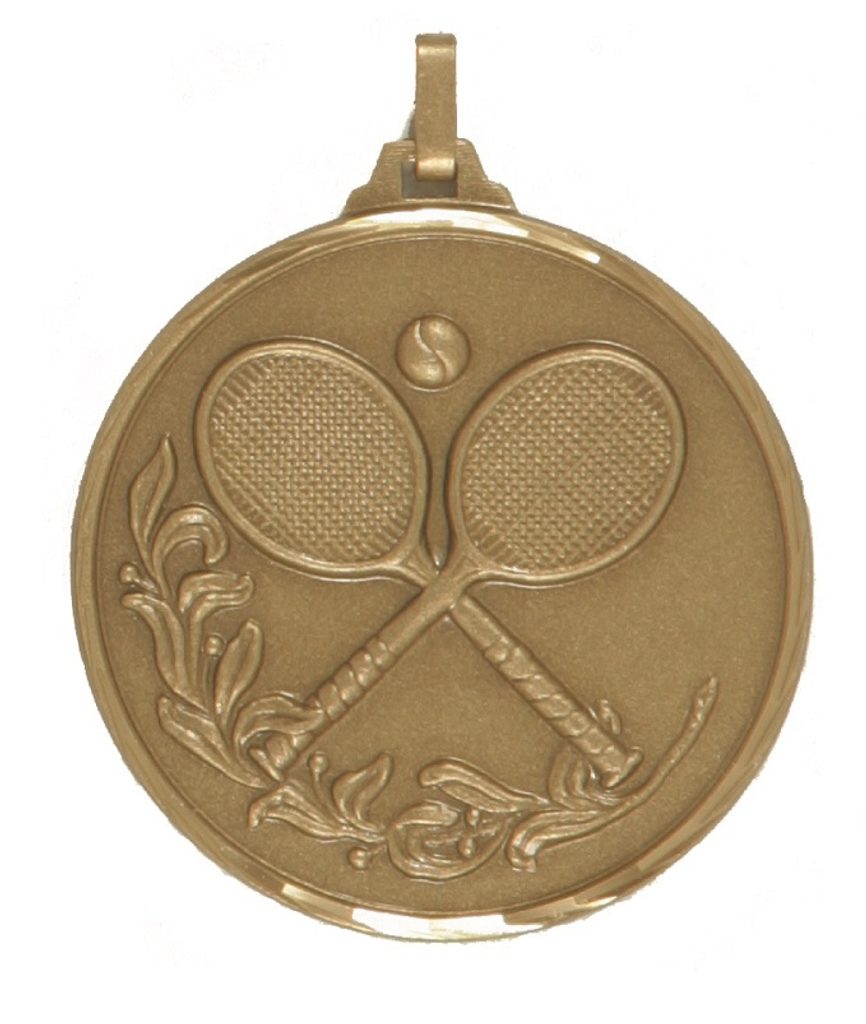 A top quality embossed diamond edged bronze tennis medal made from brass. The medal displays crossed tennis rackets and a tennis ball. Select from 42mm or 52mm diameter and the thickness is 3mm giving the medal a heavy feel. This medal can be engraved on the reverse and comes complete with a loop to accomadate a ribbon.