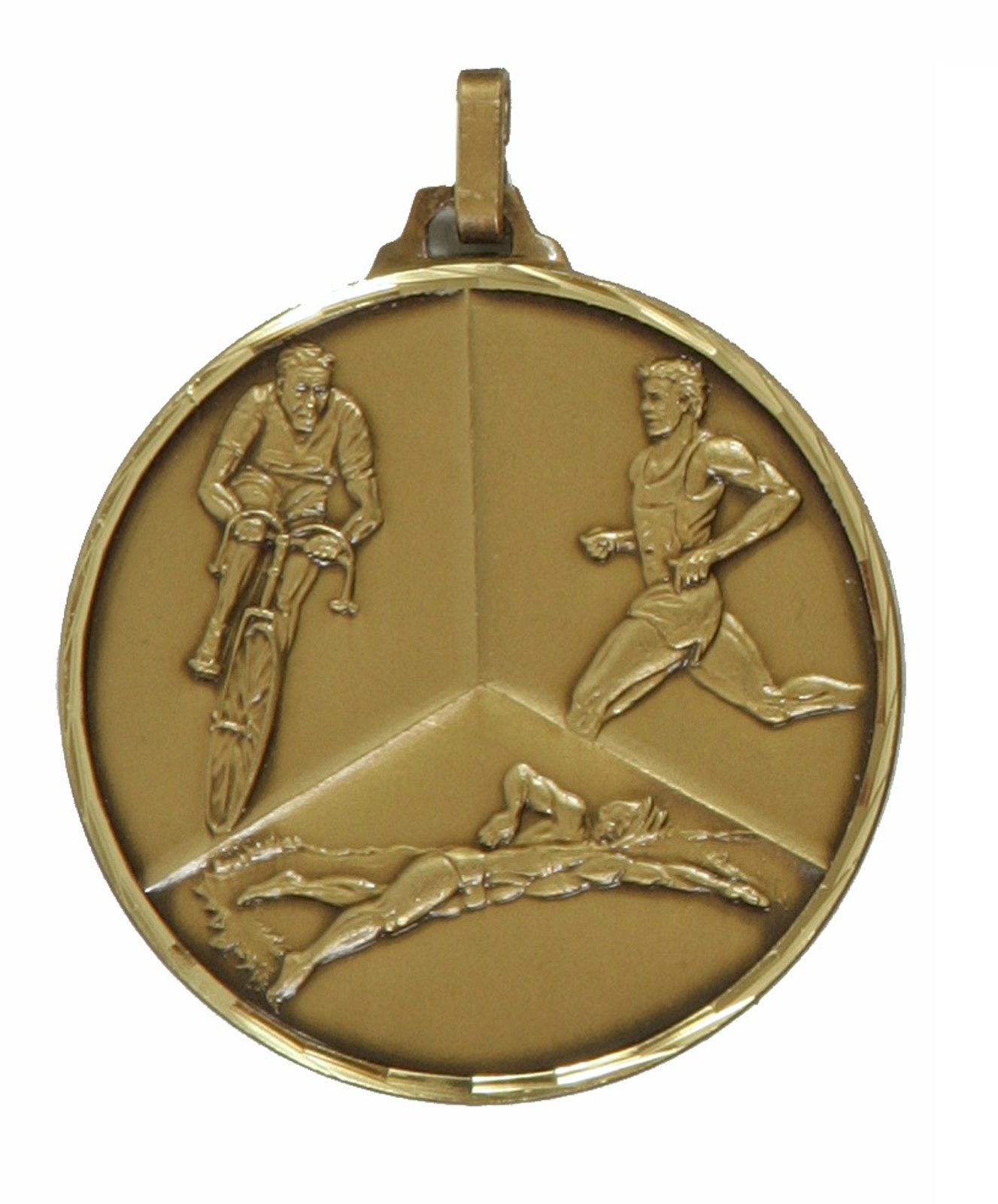 A top quality embossed diamond edged bronze triathlon medal made from brass. The medal displays the 3 events of triathlon being cycling, running and swimming. Select from 42mm or 52mm diameter and the thickness is 3mm giving the medal a heavy feel. This medal can be engraved on the reverse and comes complete with a loop to accomadate a ribbon.