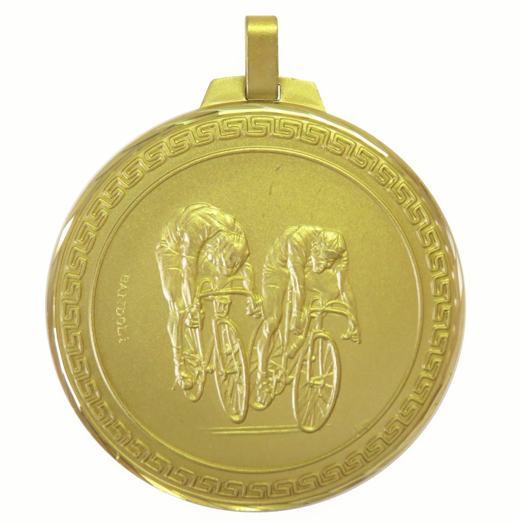 A top quality embossed diamond edged gold cycling medal made from brass. The medal displays two cyclist's in cycling action set within an aztec design.The diameter is 70mm and the thickness is 3mm giving the medal a heavy feel. This medal can be engraved on the reverse and comes complete with a loop to accommodate a ribbon.