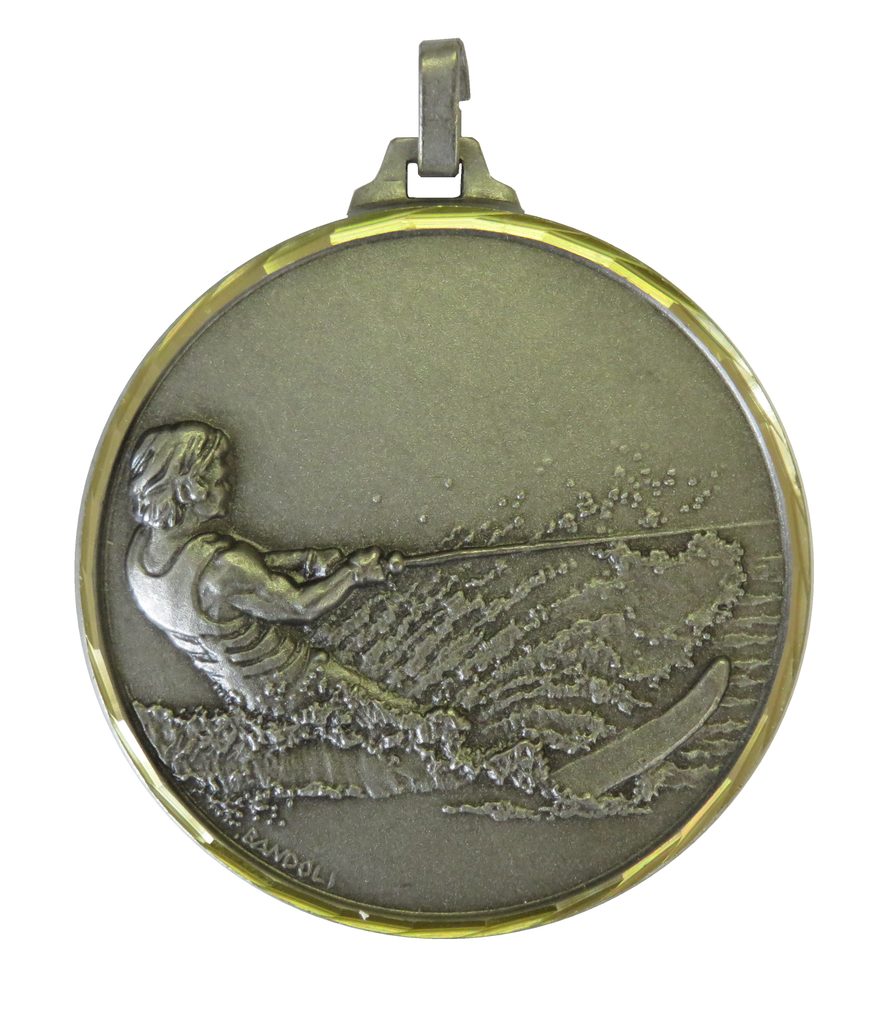 A top quality embossed diamond edged silver water skiing medal made from brass. The medal displays a water skier in action. The diameter is 52mm and the thickness is 3mm giving the medal a heavy feel. This medal can be engraved on the reverse and comes complete with a loop to accomadate a ribbon.