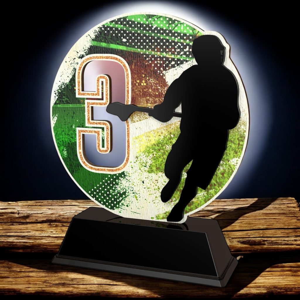 Dynamic Fusion Design: Combines a bold full-colour wood background with a sleek black acrylic lacrosse player silhouette.