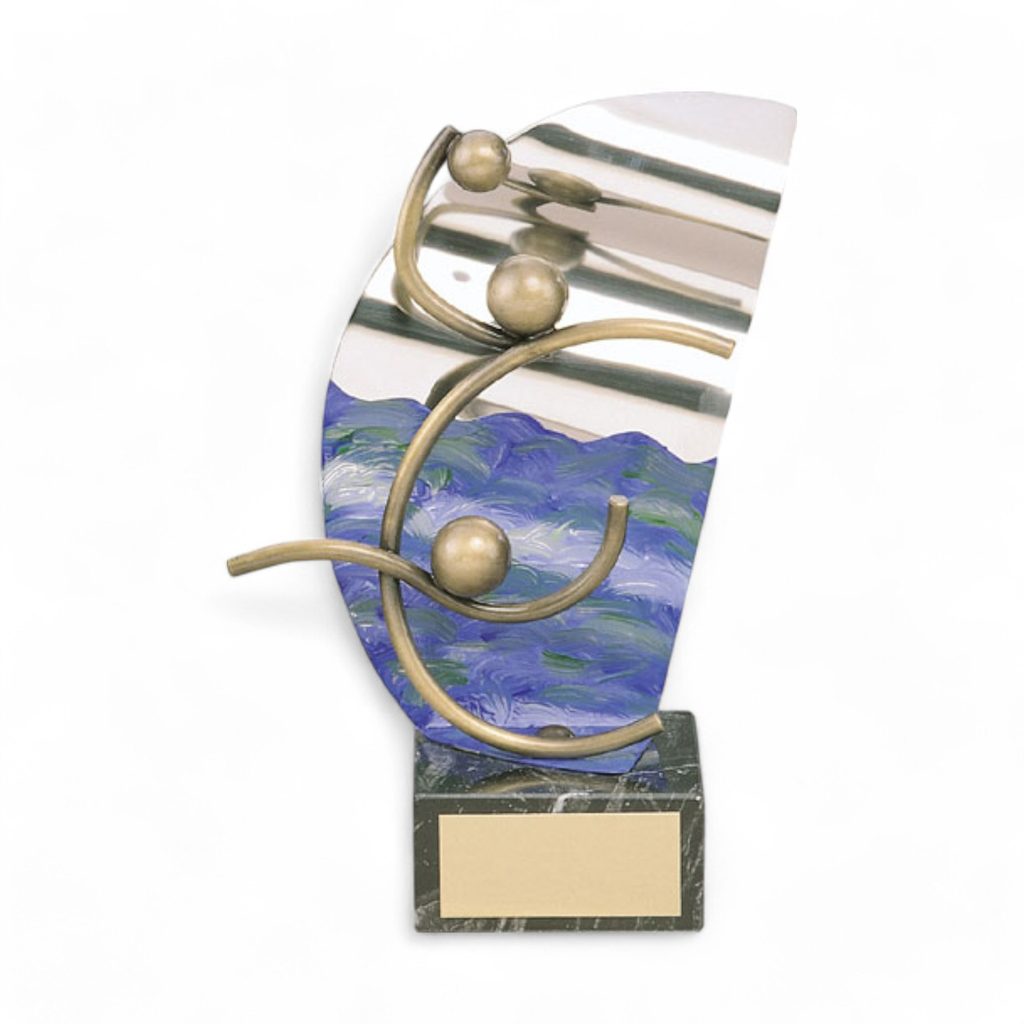 Introducing the Polentinos Water Polo Trophy—an exclusive, handcrafted metal award featuring an artfully designed water polo player set against a blue painted metal decoration. This unique display is mounted on a high-quality black marble base, offering a touch of elegance and sophistication.