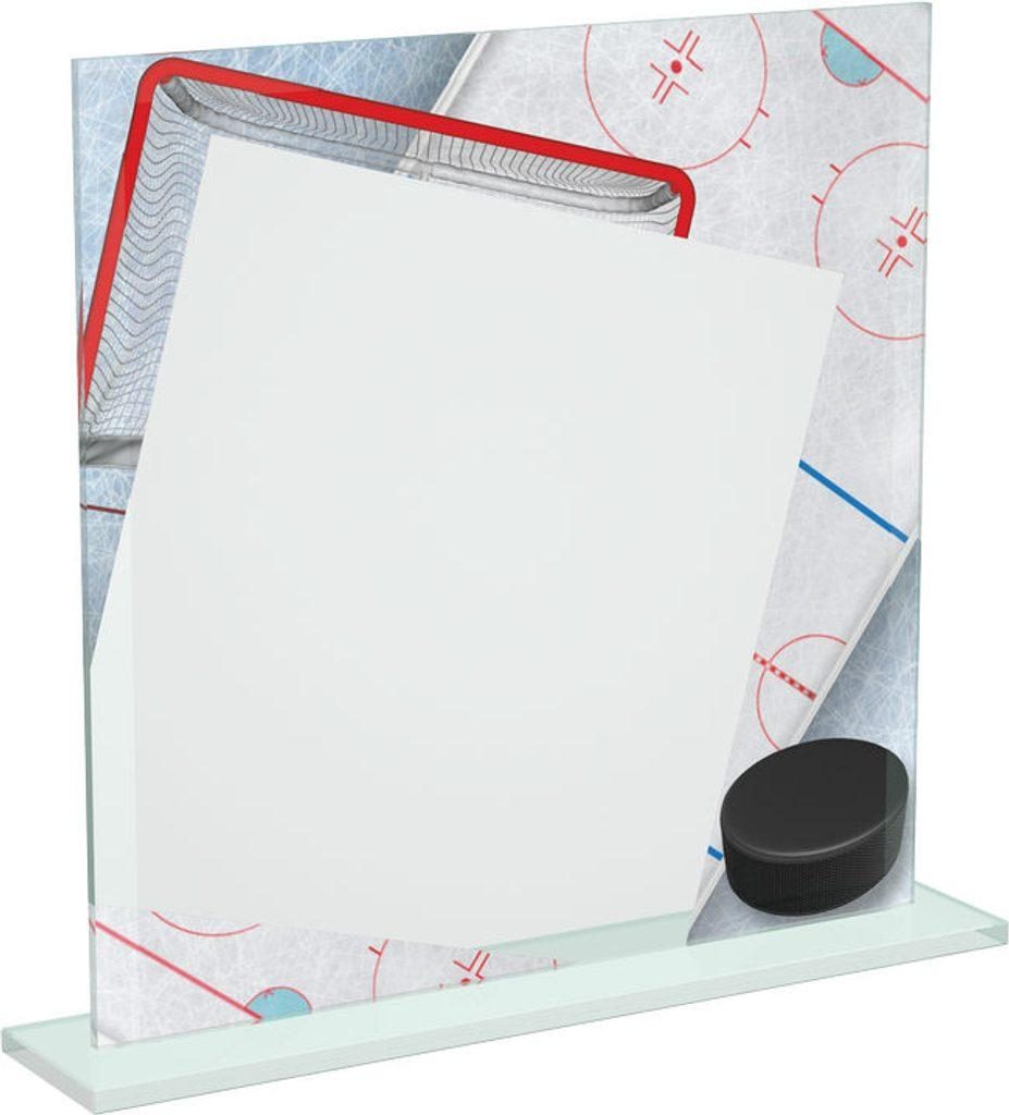 Celebrate every goal, shutout, and championship with the Eloise Ice Hockey Colour Printed Glass Award. Manufactured from 6mm thick premium glass in 150mm, 170mm, and 190mm, it showcases a vibrant full-colour UV ice hockey design with rink markings, stick, and puck, plus a clear glass panel for your logo and text. Ideal for club nights, league honours, MVP awards, and end-of-season presentations. Personalisation included.