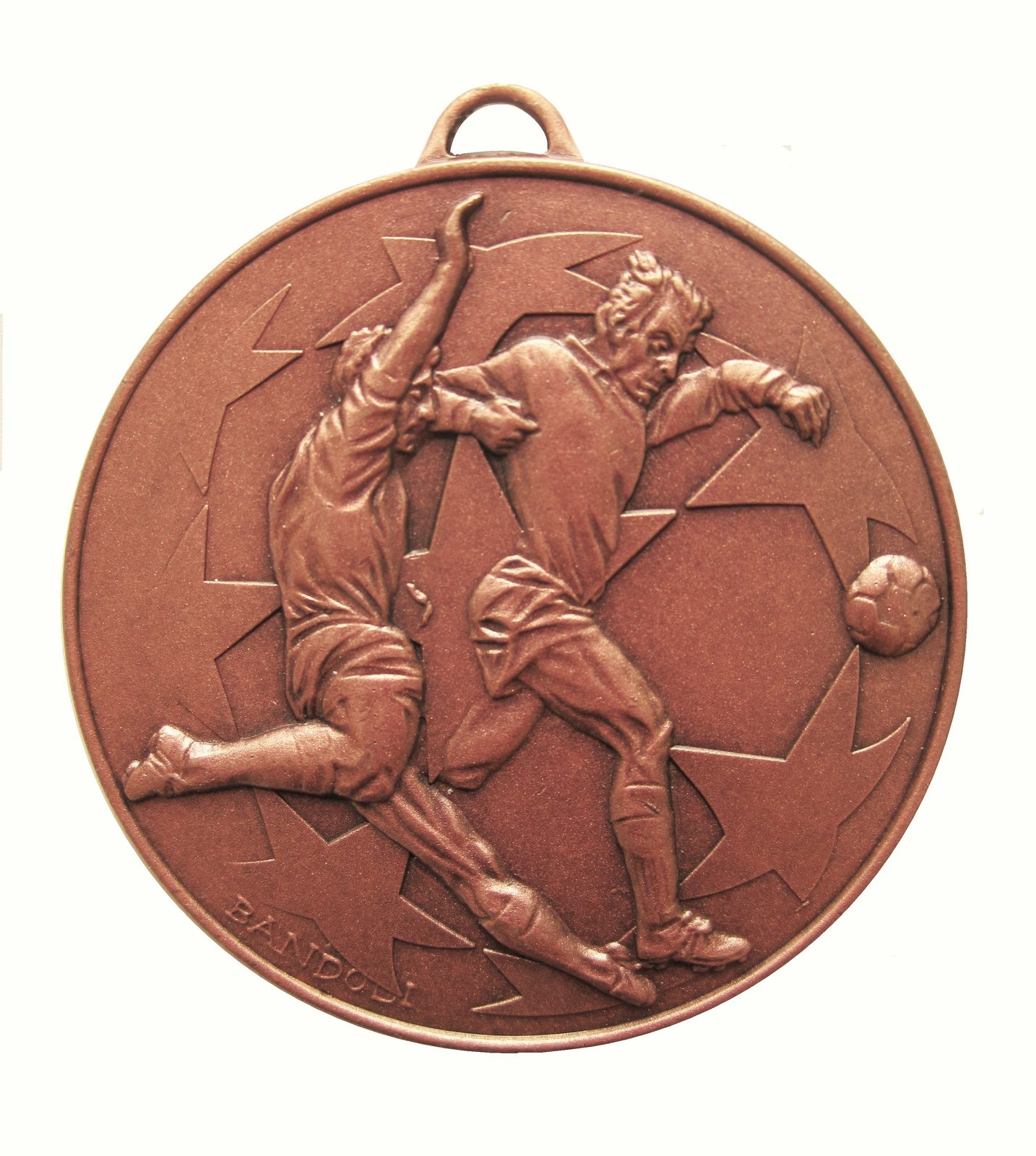 A very well priced embossed copper metal football medal displaying two footballers in action in front of champions stars.The diameter is 50mm and the thickness is 2.5mm giving the medal a heavy feel. This medal can be engraved on the reverse and comes complete with a loop to accommodate a ribbon.