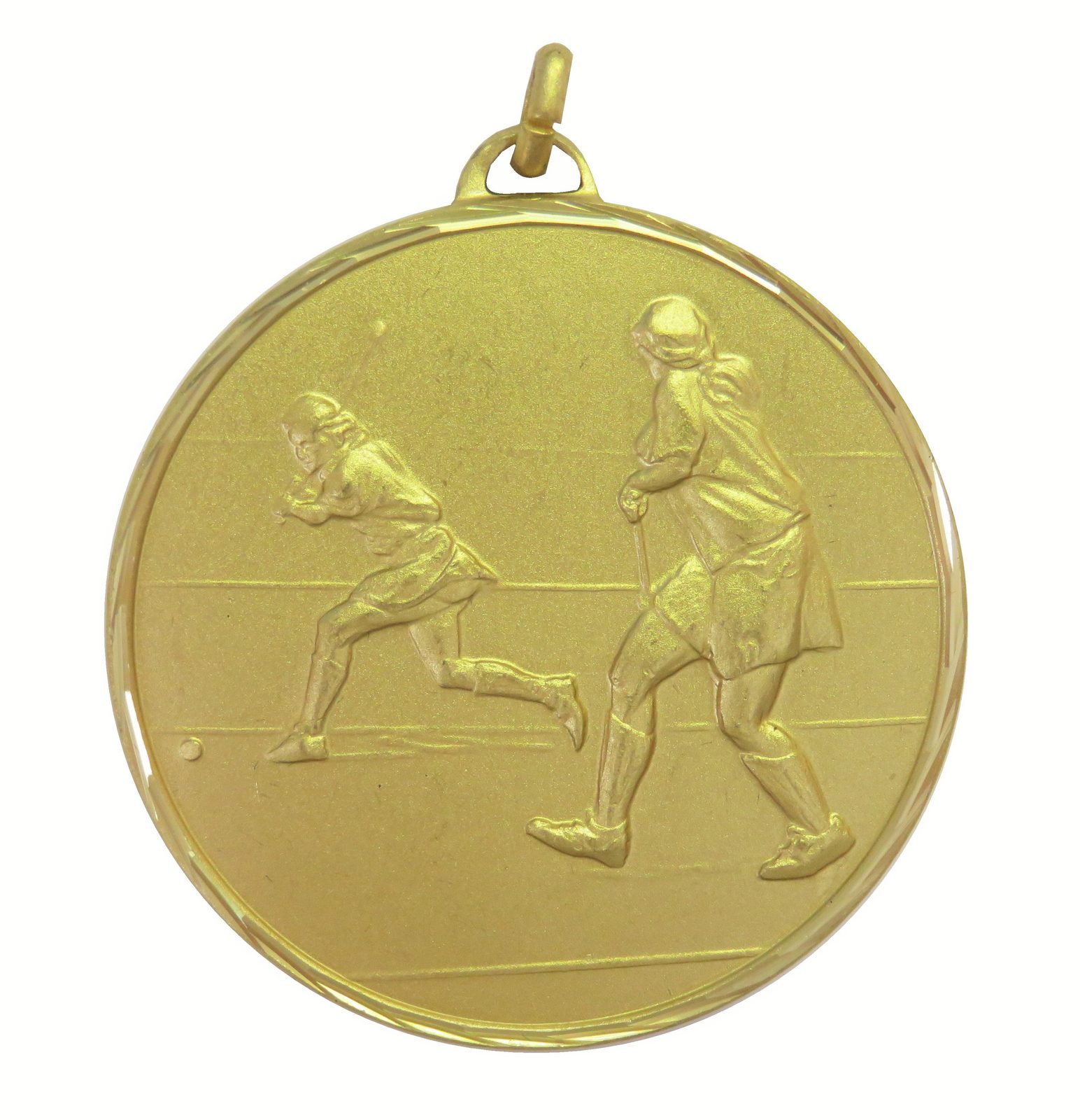 A very well priced embossed gold metal hockey medal displaying two female hockey players in action. The diameter is 50mm and the thickness is 2.5mm giving the medal a heavy feel. This medal can be engraved on the reverse and comes complete with a loop to accommodate a ribbon.