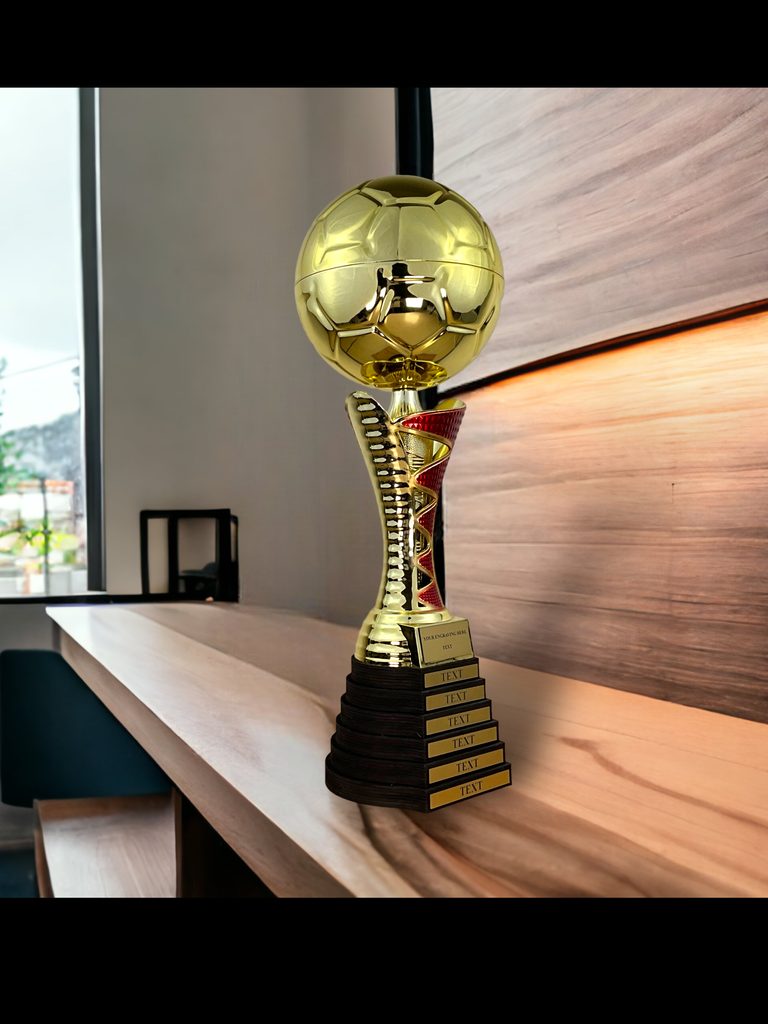 This exquisite trophy features a metal gold football mounted on a carefully constructed red and gold stem, all fixed to an impressive SIX-tiered base. The mount is crafted from sustainable birchwood, with each layer able to be engraved, making this trophy a standout perpetual award or a stunning trophy for top performers.