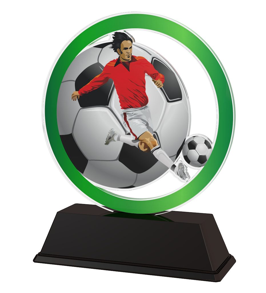The Essen Football Player Trophy is the latest in design. Cut out to shape this trophy comes to life with a high quality full colour print on the reverse side of the 4mm thick acrylic mounted on a black PVC base.