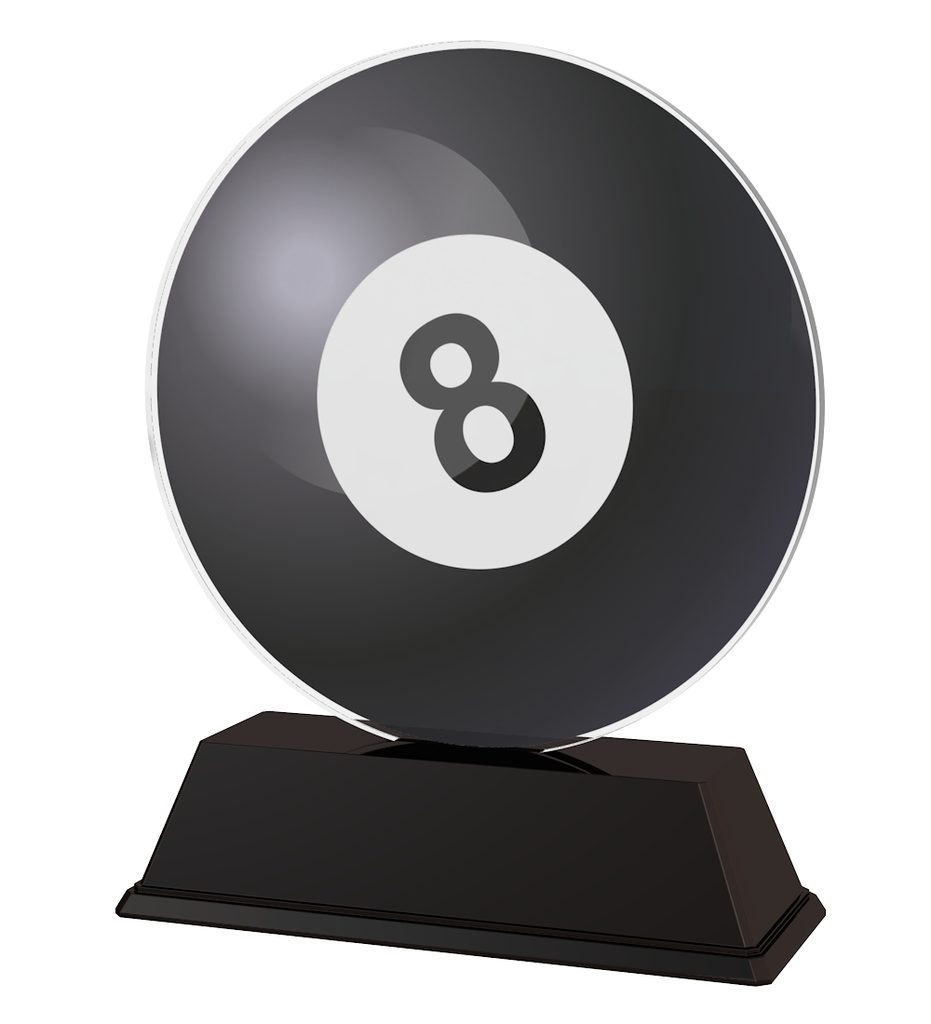 The Essen Pool Ball Trophy is the latest in design. Cut out to shape this trophy comes to life with a high quality full colour print on the reverse side of the 4mm thick acrylic mounted on a black PVC base.