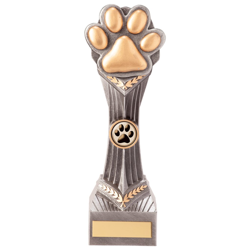 The Falcon Dog Paw Trophy is a high definition design made from top quality plastic, with beautifully displayed detail. Glazed in a stunning colour mix of antique silver and gold.
