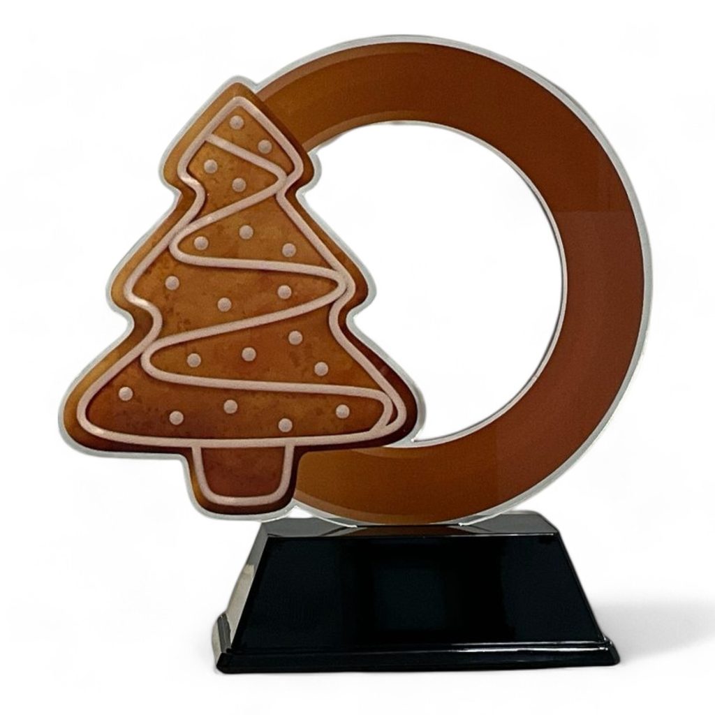 The Gingerbread Tree Award is crafted from sturdy 4mm acrylic and printed with precision using top-of-the-line technology. It is elegantly displayed on a stylish black PVC base, providing exceptional quality and value.