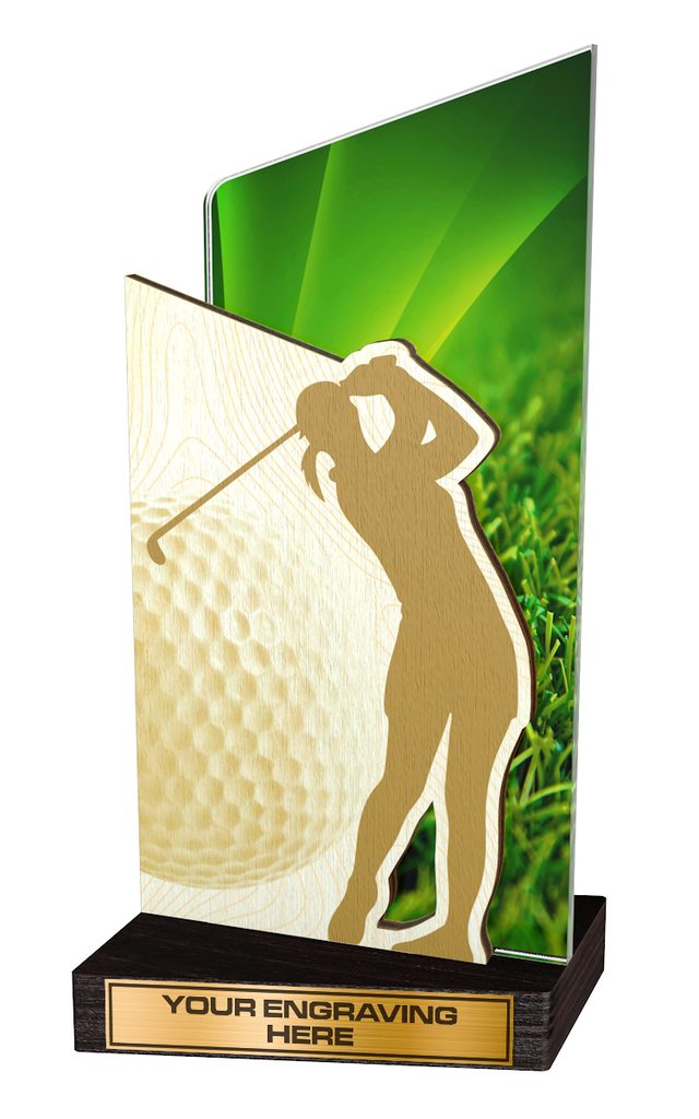 The Fusion Golf Female Player Trophy a modern style award. A totally unique concept trophy made with a combination of 6mm thick bevelled acrylic and 6mm natural sustainable birchwood. The award is mounted on a specially designed angled birchwood base. Made exclusively in our own factory this trophy is sure to be the centrepiece in any presentation.