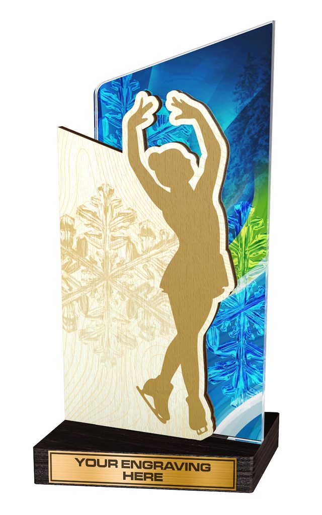 The Fusion Ice Skating Trophy a modern style award. A totally unique concept trophy made with a combination of 6mm thick bevelled acrylic and 6mm natural sustainable birchwood. The award is mounted on a specially designed angled birchwood base. Made exclusively in our own factory this trophy is sure to be the centrepiece in any presentation.