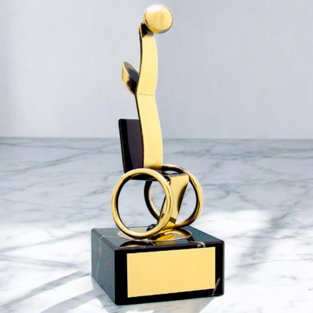 Celebrate the strength, agility, and dedication of wheelchair basketball players with the Galicia Wheelchair Basketball Trophy. This unique design features a stylised figure in a wheelchair, arms raised in motion, capturing the dynamic energy and skill essential to the sport. The polished golden finish highlights the powerful silhouette, while the solid marble base provides stability and elegance.