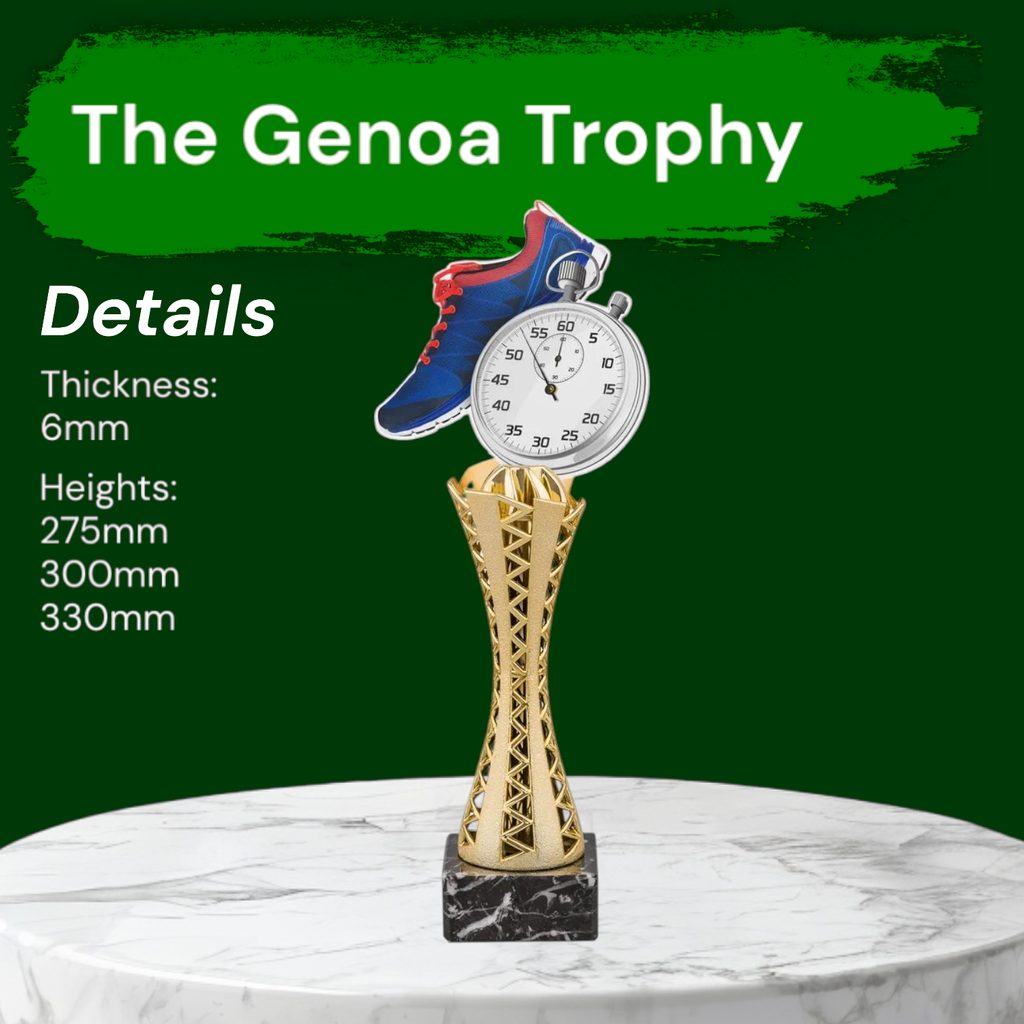 The Genoa Athletics Stopwatch Trophy combines sleek modern materials with classic elements, creating a standout award for any occasion.