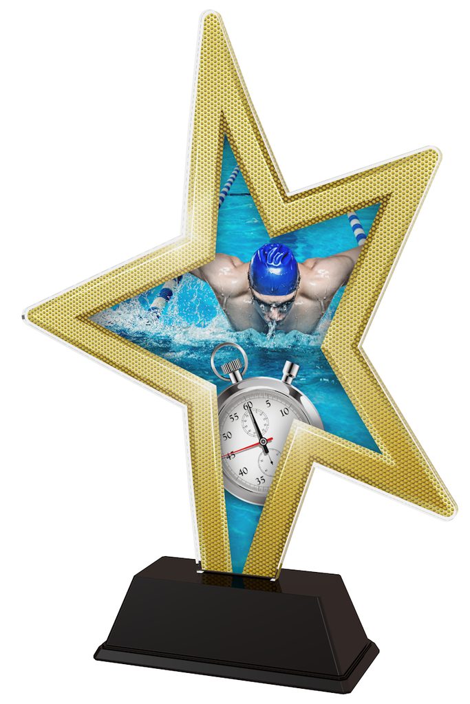 The Swimming Gold Star Trophy is a modern take on a classic award. Cut to shape this trophy comes to life with a high quality full colour print on the reverse side of the 4mm thick acrylic mounted on a black PVC base.