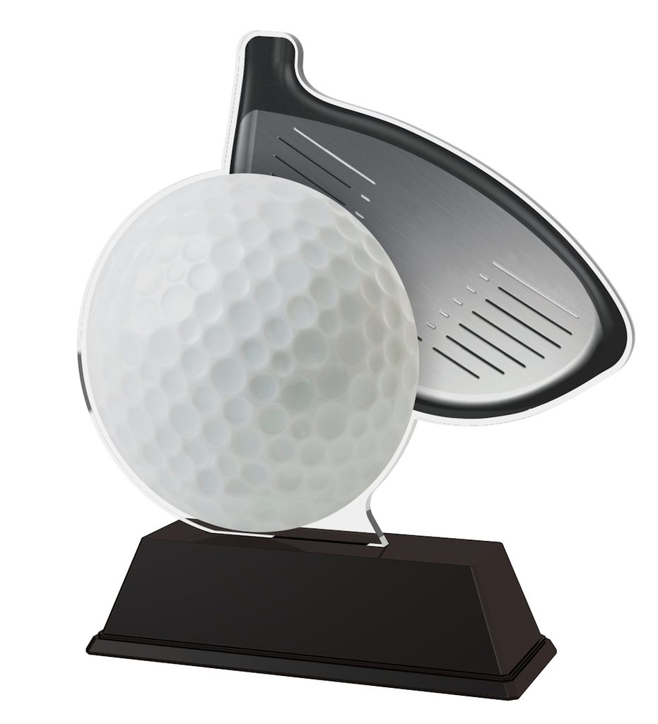 A contemporary designer Golf Ball trophy. Cut to shape this award comes to life with a high quality full colour print on the reverse side of the 4mm thick acrylic mounted on a black PVC base. Comes in 4 sizes 4", 5 3/4", 6", 6 1/2".