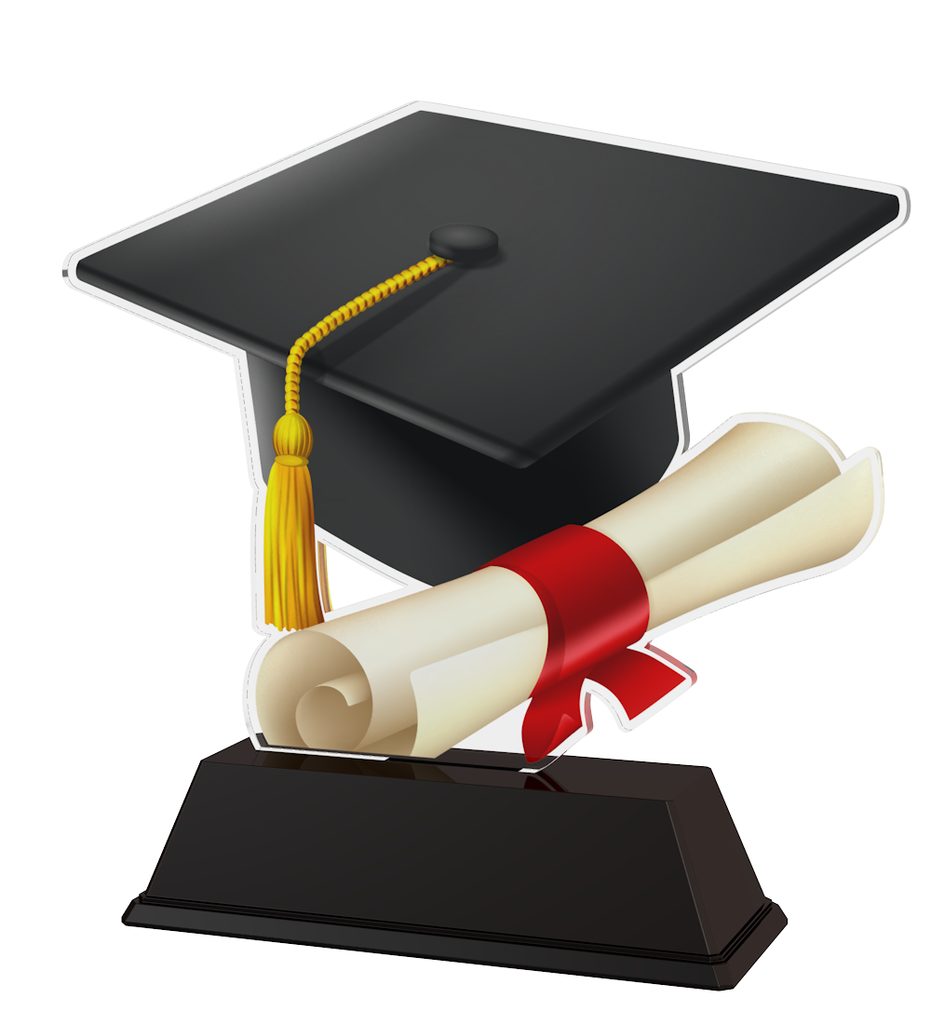 A contemporary designer Graduation trophy. Cut to shape this award comes to life with a high quality full colour print on the reverse side of the 4mm thick acrylic mounted on a black PVC base. Comes in 4 sizes 4", 5 3/4", 6", 6 1/2".