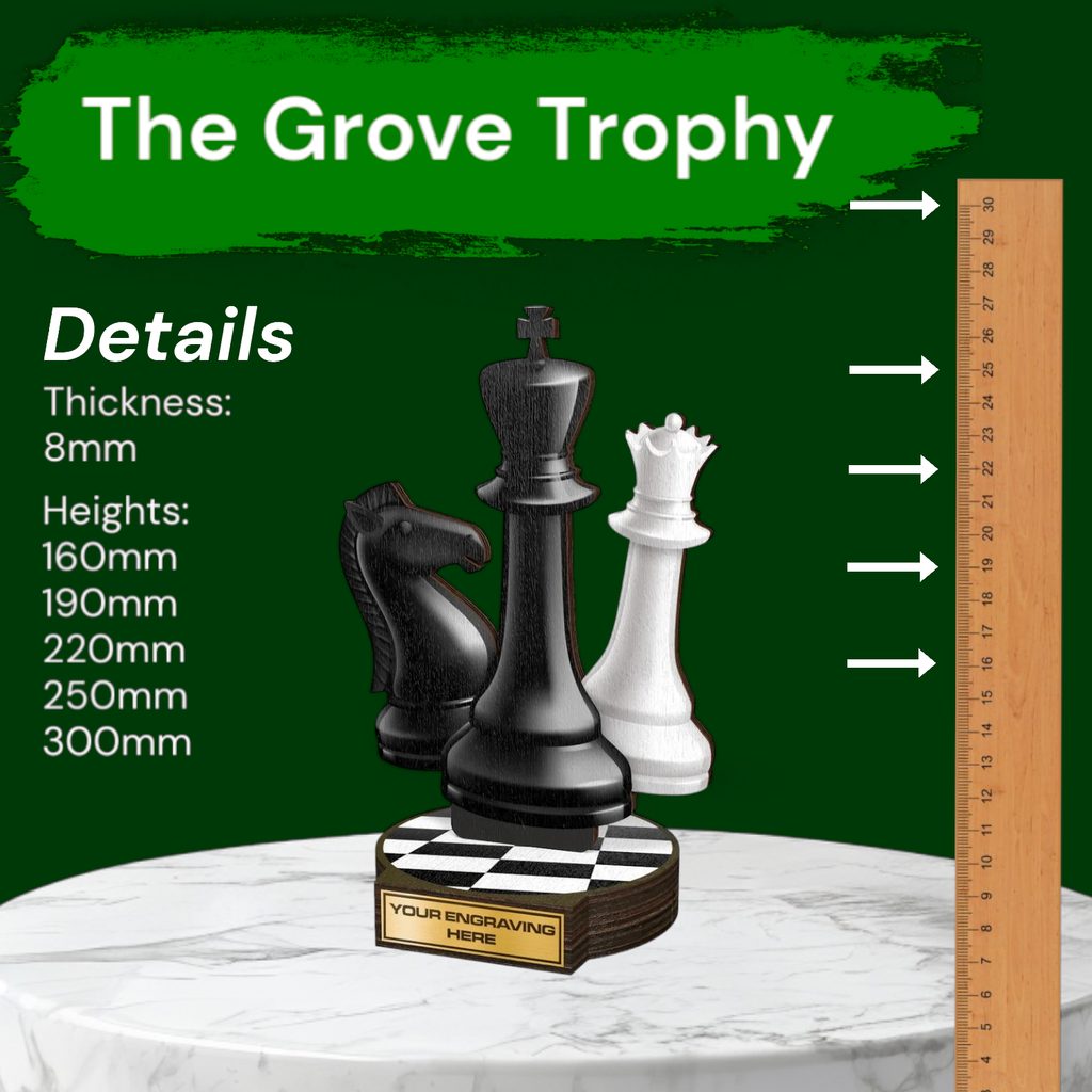 The Grove Chess Real Wood Trophy is a stunning eco friendly award made from 8mm thick natural birch plywood, mounted on a thick wooden circular base. A sustainable product that is part of a collection designed and manufactured in our own factory. Not only for the environmentally conscious, this trophy will be the centrepiece in any presentation.