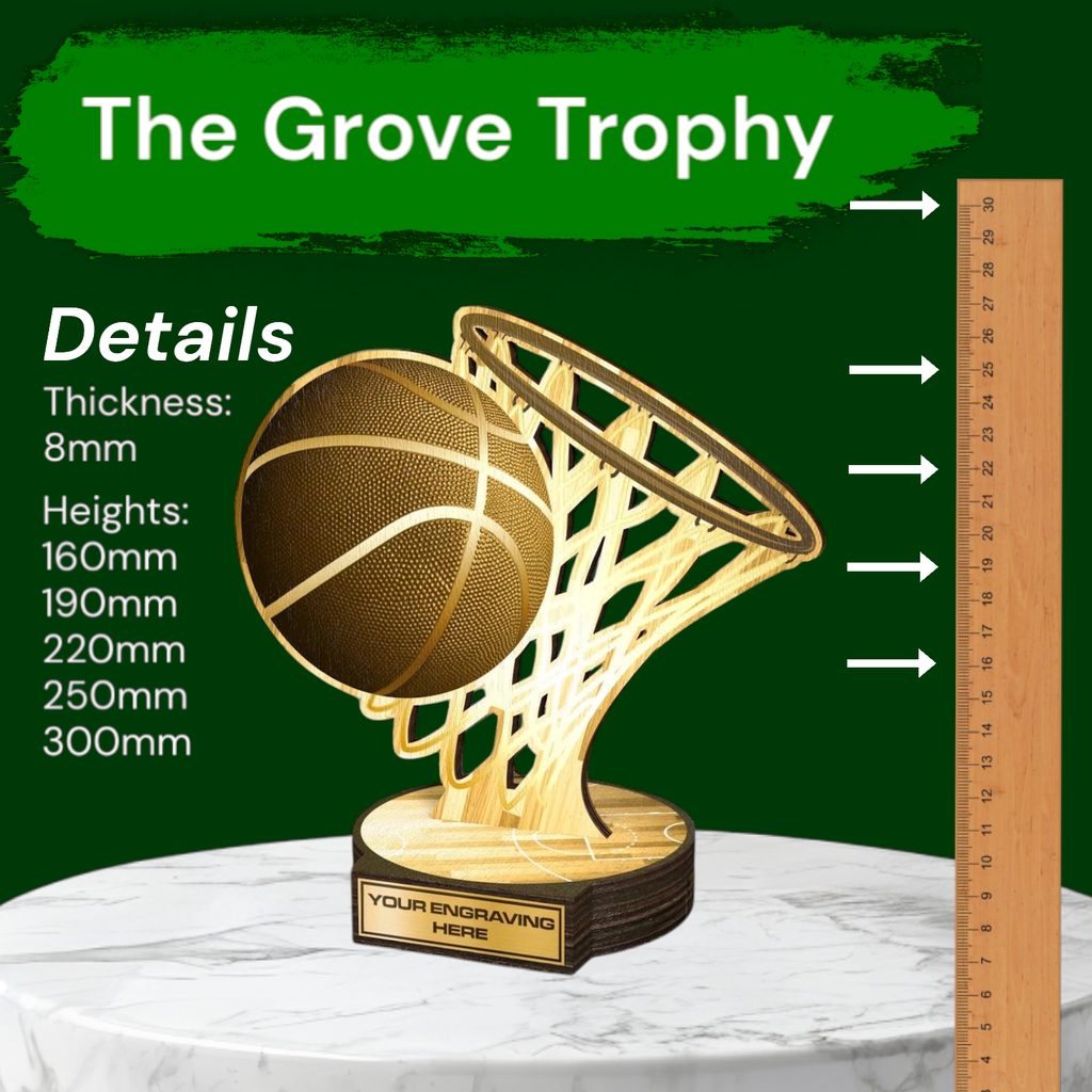 The Grove Classic Real Wood Trophy is a magnificent, 2D eco-friendly award crafted from 8mm thick natural birch plywood and elegantly mounted on a sturdy wooden circular base. This sustainable product is part of a collection meticulously designed and manufactured in our very own factory. Not only ideal for the environmentally conscious, this trophy is sure to be the focal point of any presentation.