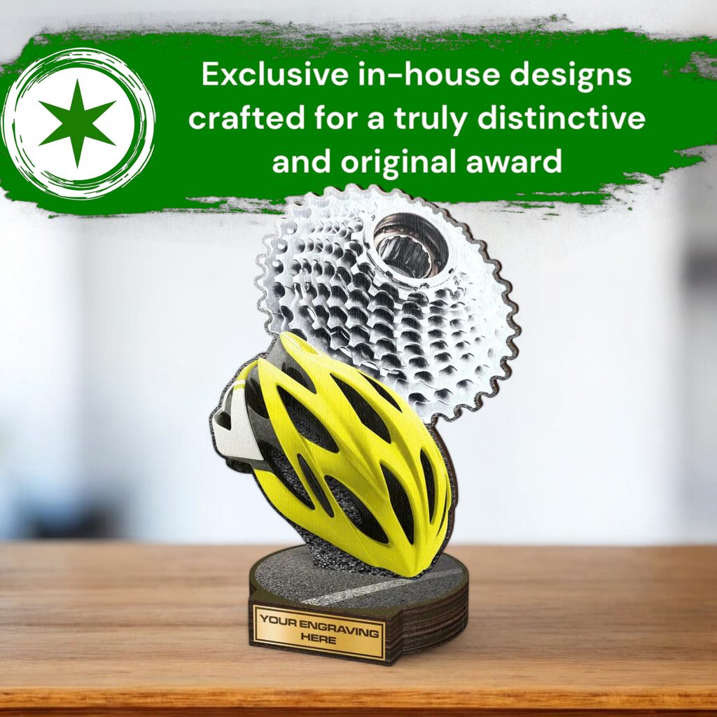 The Grove Cycling Real Wood Trophy is a stunning eco friendly award made from 8mm thick natural birch plywood, mounted on a thick wooden circular base. A sustainable product that is part of a collection designed and manufactured in our own factory. Not only for the environmentally conscious, this trophy will be the centrepiece in any presentation.