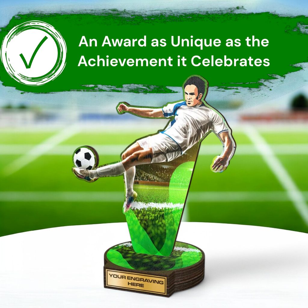 The Grove Football Action Player Real Wood Trophy is a stunning eco friendly award made from 8mm thick natural birch plywood, mounted on a thick wooden circular base. A sustainable product that is part of a collection designed and manufactured in our own factory. Not only for the environmentally conscious, this trophy will be the centrepiece in any presentation.