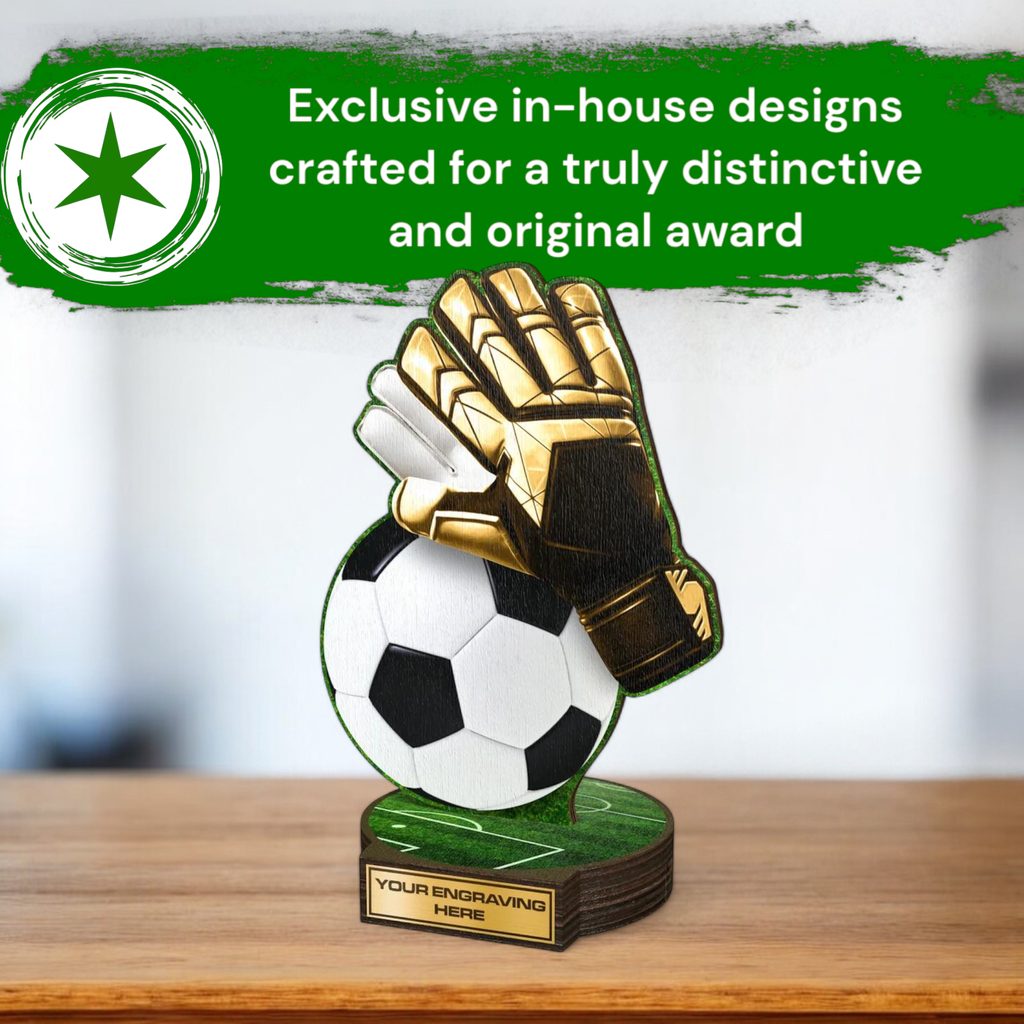 The Grove Football Goalkeeper Real Wood Trophy is a stunning eco friendly award made from 8mm thick natural birch plywood, mounted on a thick wooden circular base. A sustainable product that is part of a collection designed and manufactured in our own factory. Not only for the environmentally conscious, this trophy will be the centrepiece in any presentation.