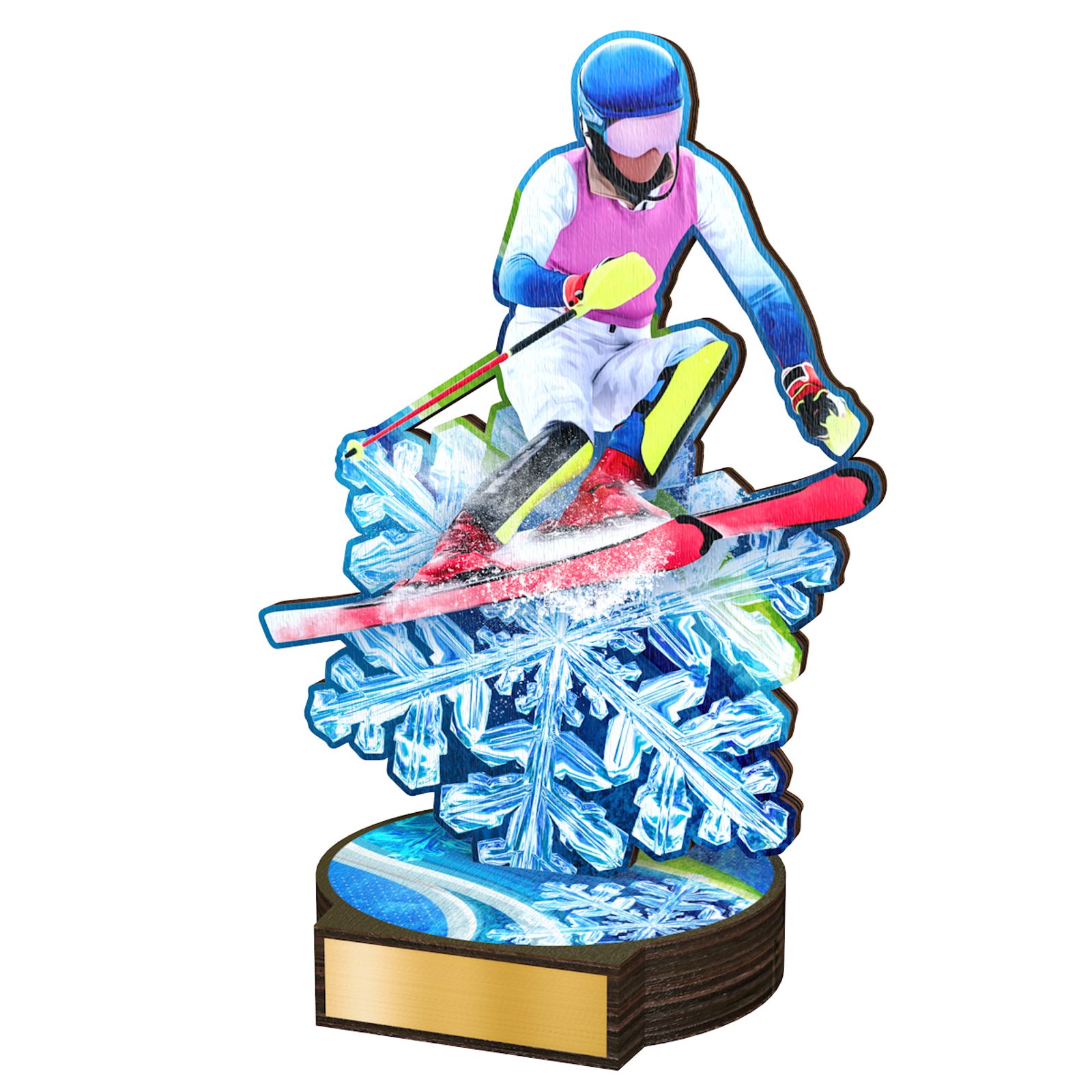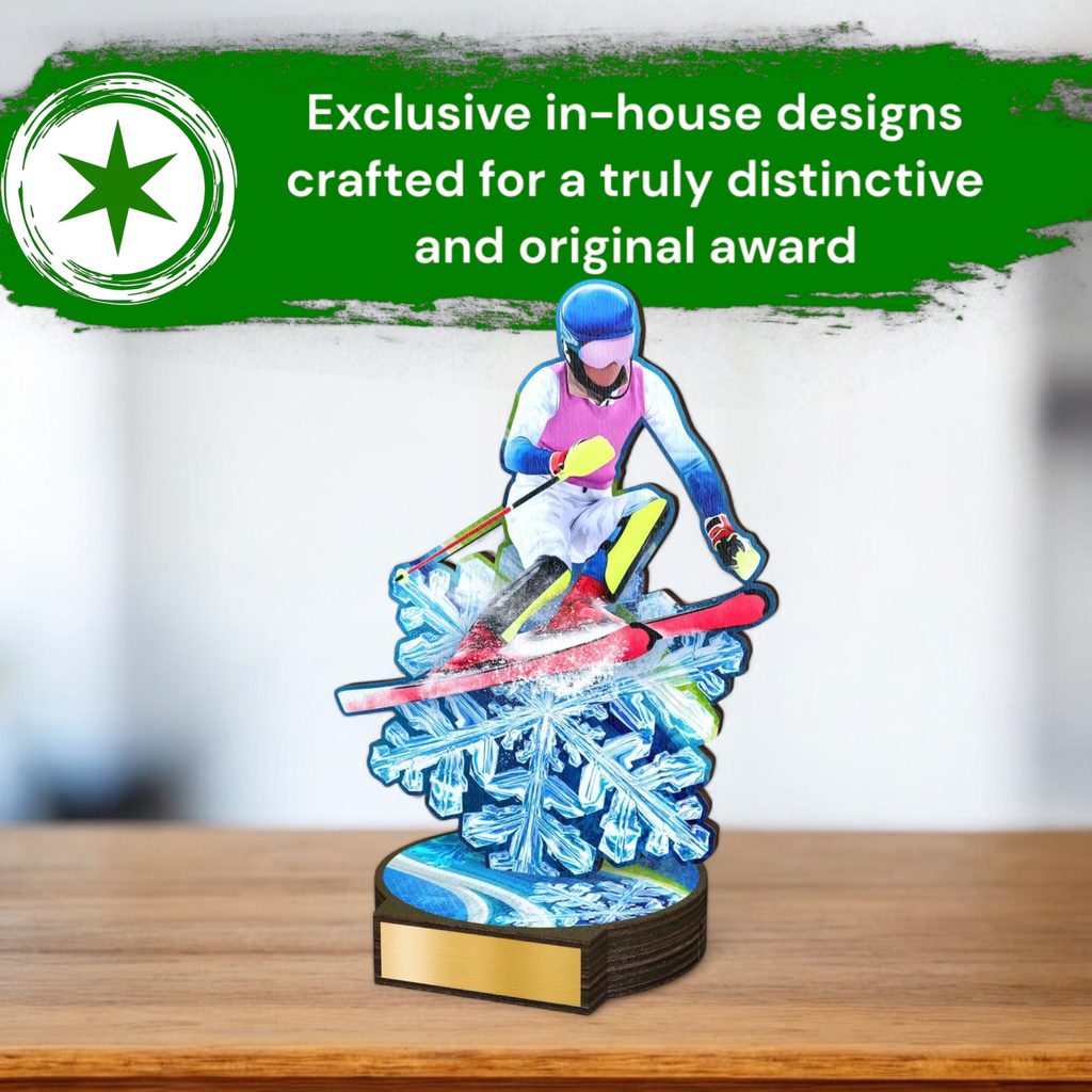 The Grove Womens Downhill Skiing Real Wood Trophy is a stunning eco friendly award made from 8mm thick natural birch plywood, mounted on a thick wooden circular base. A sustainable product that is part of a collection designed and manufactured in our own factory. Not only for the environmentally conscious, this trophy will be the centrepiece in any presentation.
