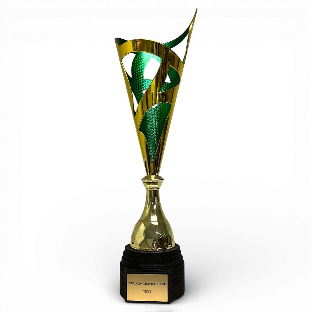 The Havana Gold & Green Blade Trophy is a bold contemporary award combining a rich gold finish with vibrant green detailing. Mounted on a natural wood base, it delivers strong visual impact and a modern look for standout presentations.