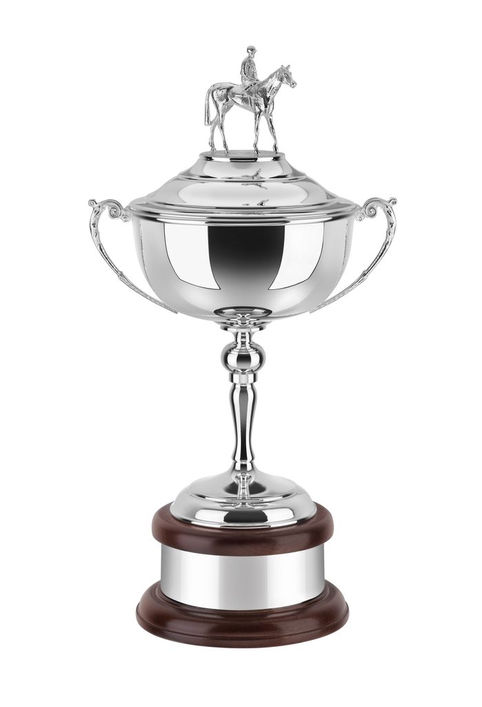 The Horse & Jockey Silver Plated Cup is a new design made in Great Britain by Swatkins. A superb quality cup that is mounted onto a circular mahogany base and plinth band. A metal horse and jockey figure comes mounted on the lid.