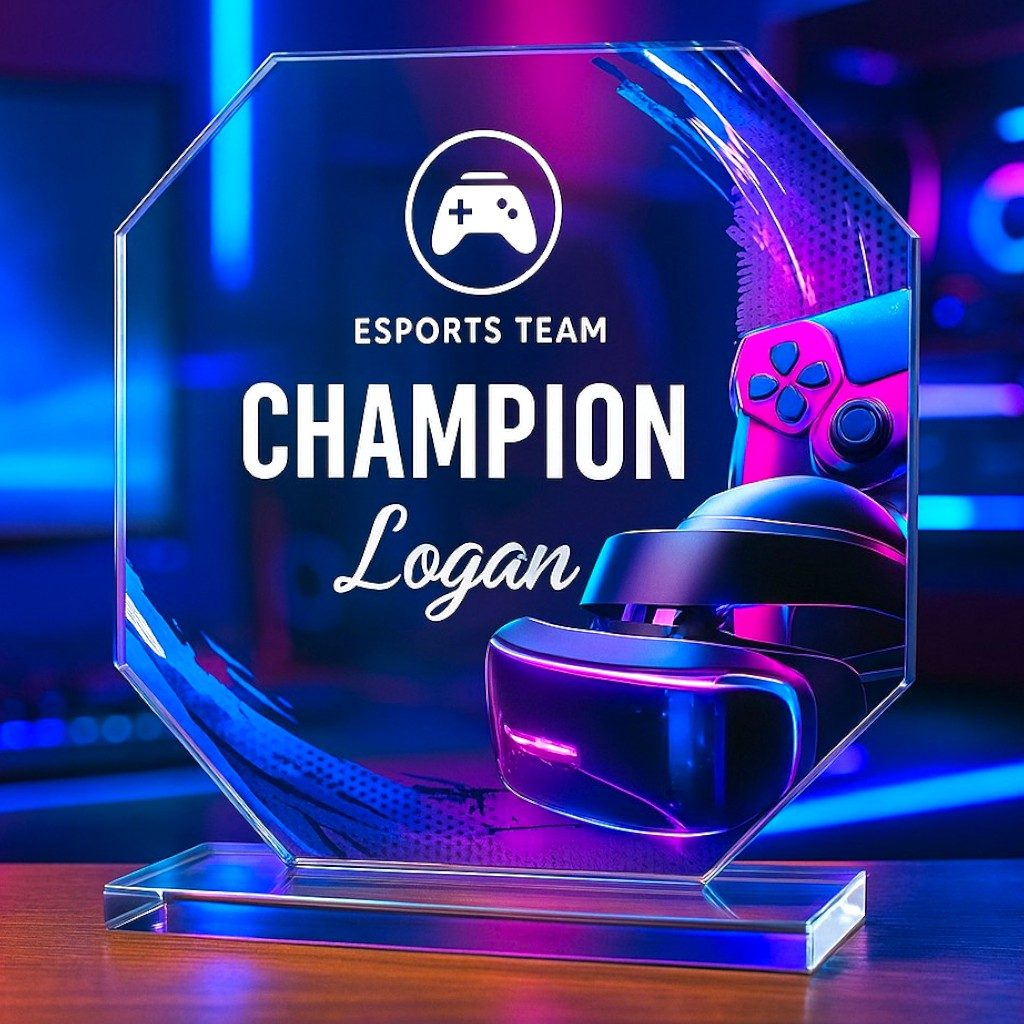Striking esports design available in full colour, gold, silver, or bronze