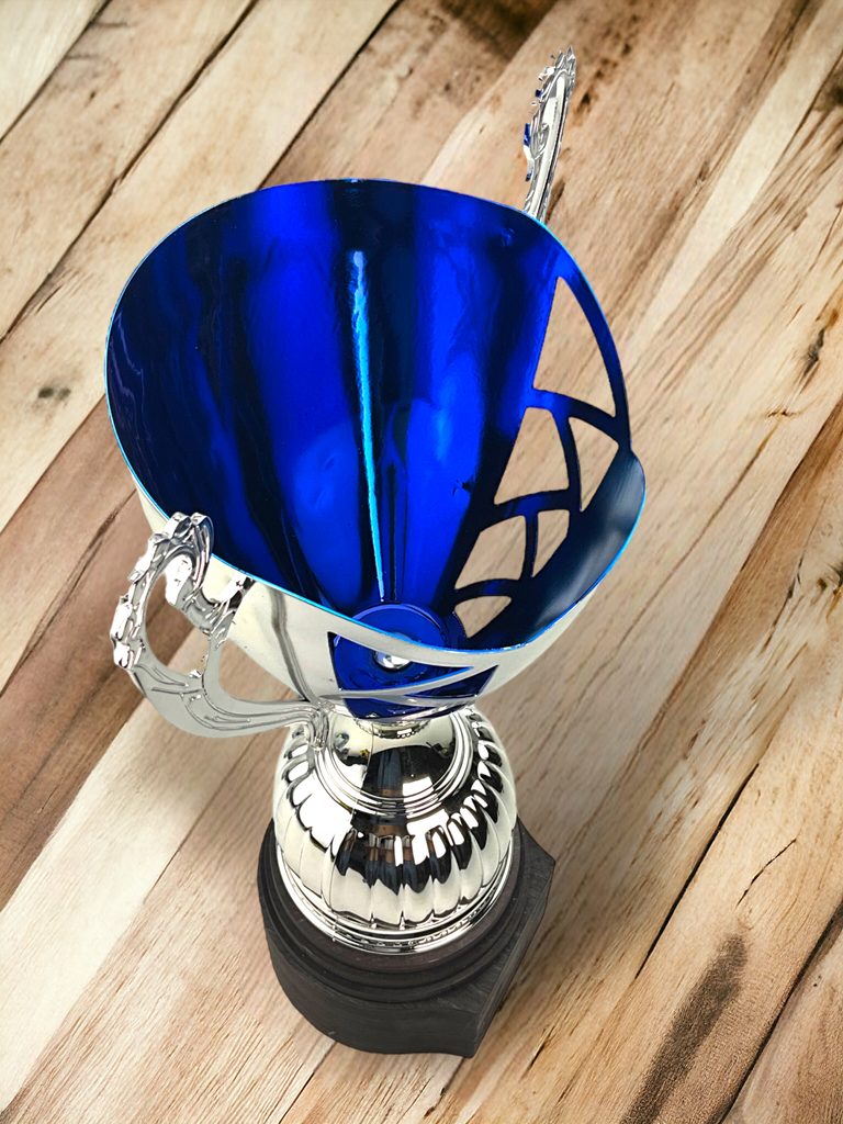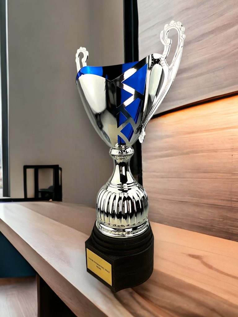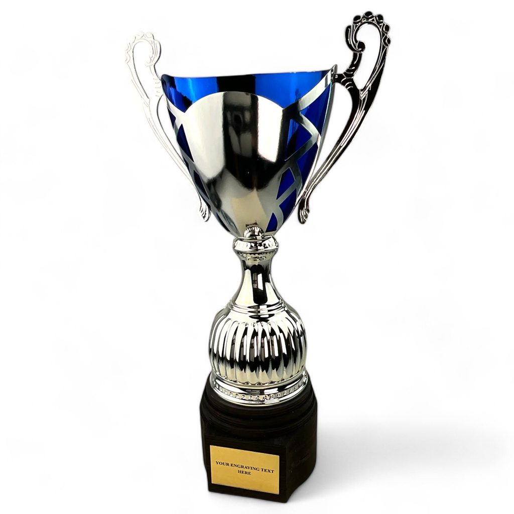 The Lamar Silver & Blue Cup is one of Trophy Monster’s standout best sellers, combining bold colour contrast with a truly distinctive silhouette. Featuring a striking silver metal bowl with vibrant blue detailing, ornate handles and a sculpted stem, this trophy is finished on a handcrafted real birch wood base for a premium look.