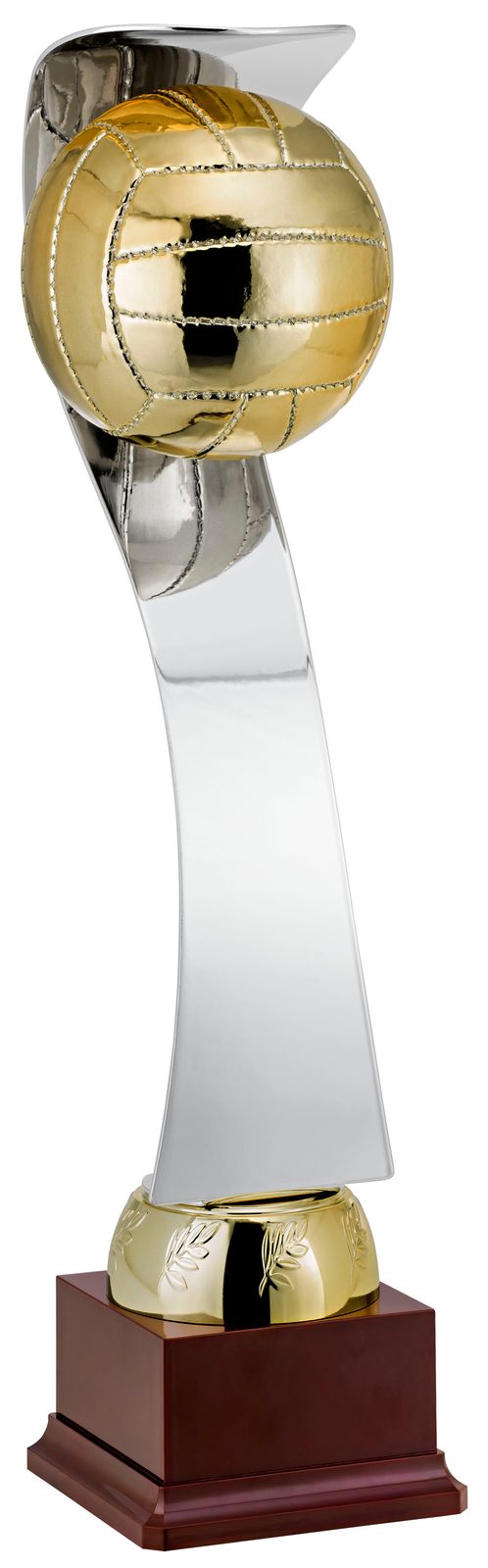 The Langman Volleyball Award is designed and manufactured in Italy. The ball and stem are metal sitting on a small gold plastic circular riser with a total modern look. The trophy comes in three very large sizes mounted on weighted PVC bases.