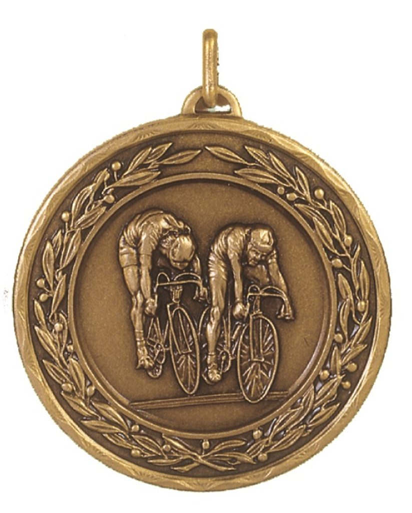 A high quality embossed bronze metal cycling medal displaying two cyclists within a laurel design. The diameter is 50mm and the thickness is 3mm giving the medal a heavy feel. This medal can be engraved on the reverse and comes complete with a loop to accomadate a ribbon.